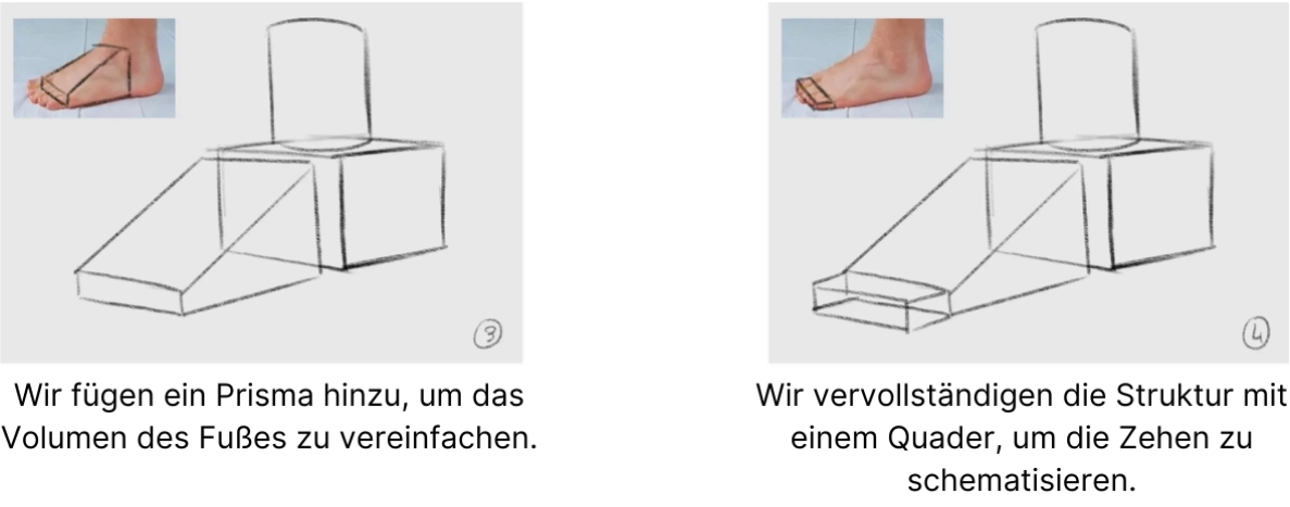 Nachdem du nun den Trick der Zerlegung als nützliches Hilfsmittel auch beim Zeichnen von Füßen verstanden hast, solltest du in der Lage sein, fast alle Posen von Füßen zu zeichnen. Verwende immer einfache Formen, um Volumen zu zerlegen: Das ist wirklich das Geheimnis, um die Anatomie von Füßen realistisch wiederzugeben.