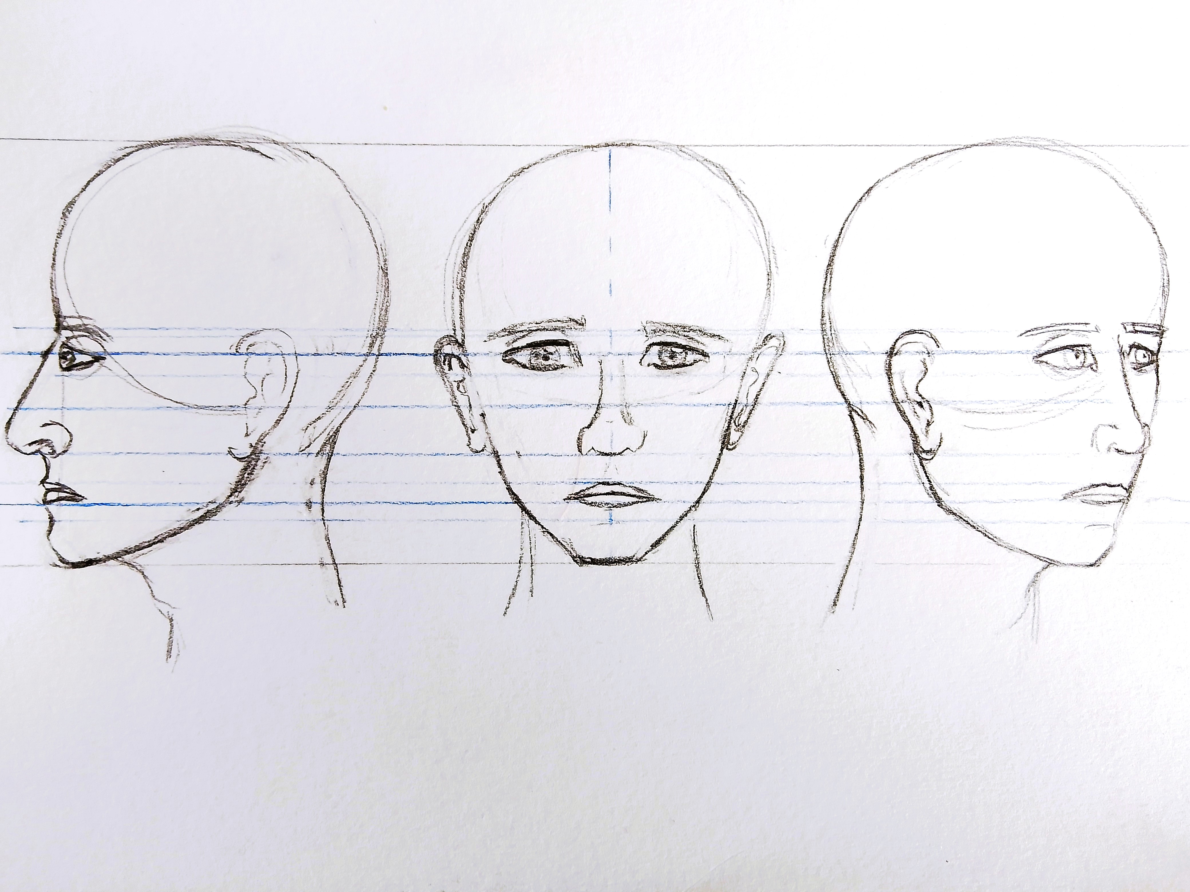 C'est vraiment pas mal ! Le visage de face a de super proportions, il y a juste quelques problèmes de symétries. Même si un visage n'est jamais vraiment symétrique c'est important de garder de la cohérence, là par exemple le nez penché un peu trop d'un côté, idem pour les yeux...Le visage de profil est plutôt bon également, les proportions sont aussi bien réussit, le principal point à revoir c'est le volume de la boîte crânienne qui est un peu trop plat sur ton dessin. C'est au niveau du 3/4 qu'il y a le plus de chose à revoir, mais comme tu l'as dit c'rsy pas facile. Globalement ton 3/4 a un effet un peu "ecrasé", il manque de volume sur la boîte crânienne mais aussi sur le côté opposé. En revanche là encore les proportions sont plutôt bonnes. En sommes tu t'en es vraiment bien sortit ! 👍