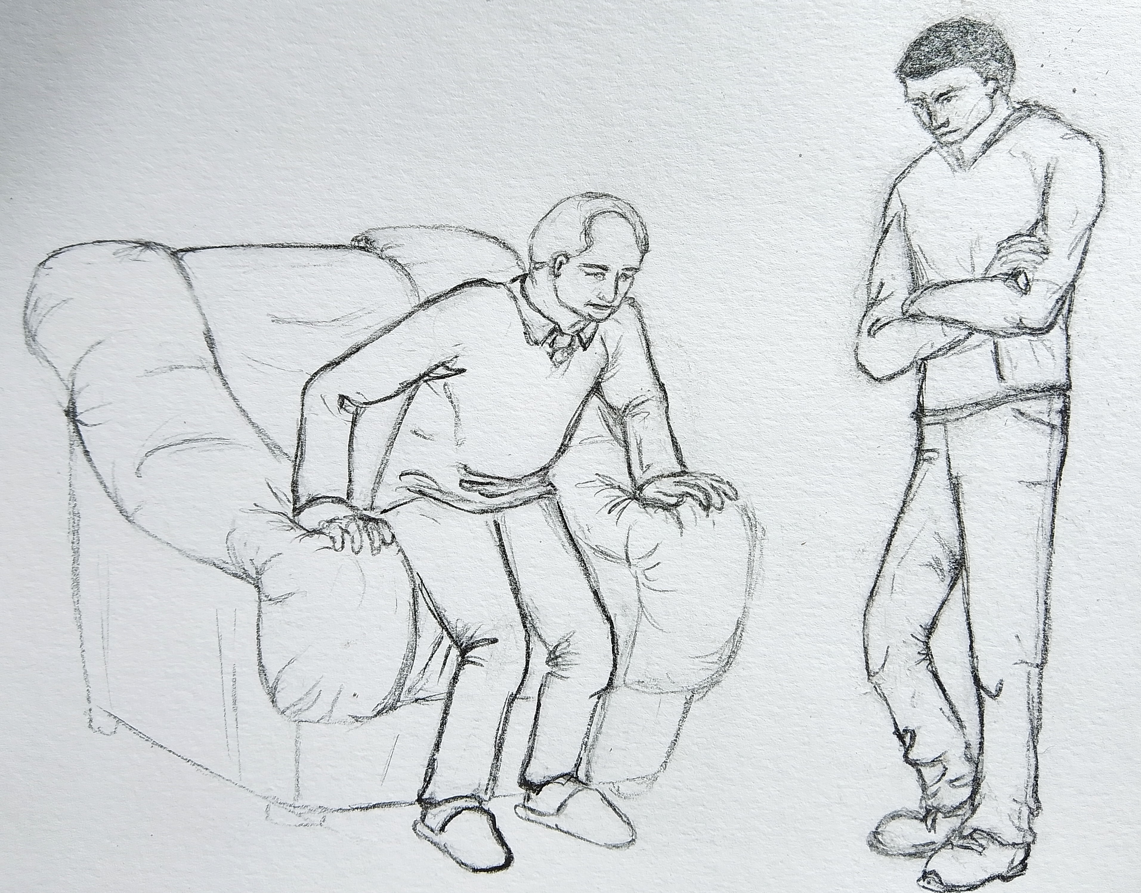 Bonjour, voici mes 3 poses en 2 dessins parce que je voulais rapprocher 2 personnages pour les dessiner en proportion l'un par rapport à l'autre, celui étant debout devant être significativement plus grand que l'homme qui se lève de son fauteuil. mais là, c'est peut-être beaucoup non ?