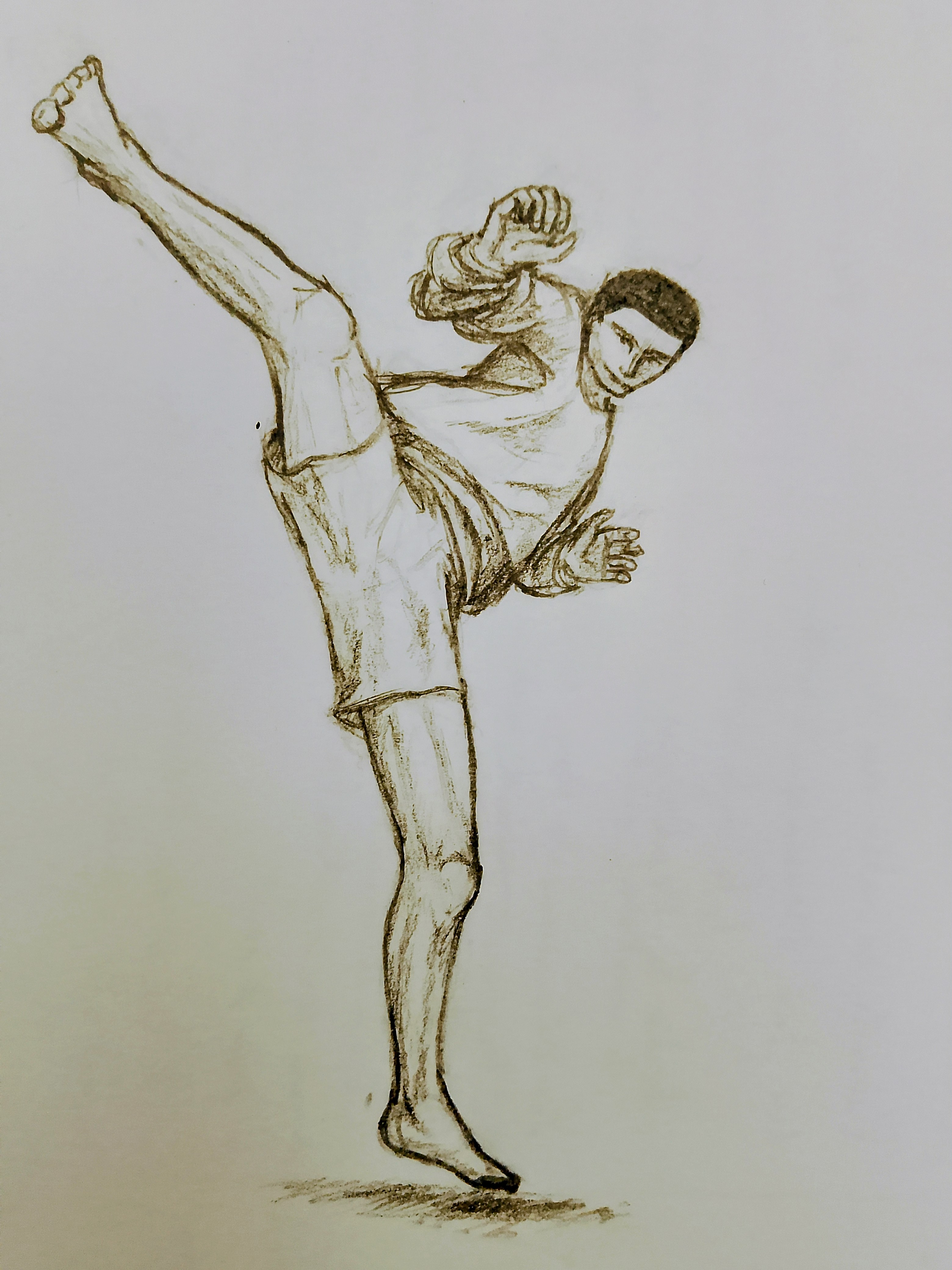Pour la 3ème pose, je me suis inspirée d'une vidéo où j'ai fait arrêt sur image, j'ai changé les proportions et le visage du combattant pour le faire ressembler à mon personnage principal. Je me suis beaucoup donné de mal sur celui-là et on m'a fait remarqué que le pied en l'air n'était pas aligné avec le genou. Le problème, c'est que cette partie était complètement floue avec la vitesse et j'ai galéré à improviser. Je me suis dit qu'il y avait effectivement une rotation mais qu'elle restait physiologique (je suis ostéopathe pour animaux, mais je connais quand même l'anatomie humaine...)