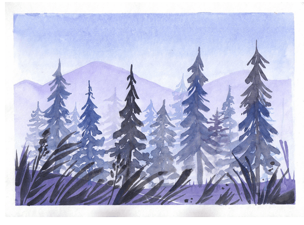 Tu as fait un travail très propre en profitant de la forme du pinceau pour créer les arbres et l'herbe. En revanche, au fond, il y a de douces transitions du bleu vers le blanc, ce qui nous donne une atmosphère froide. Bien joué !