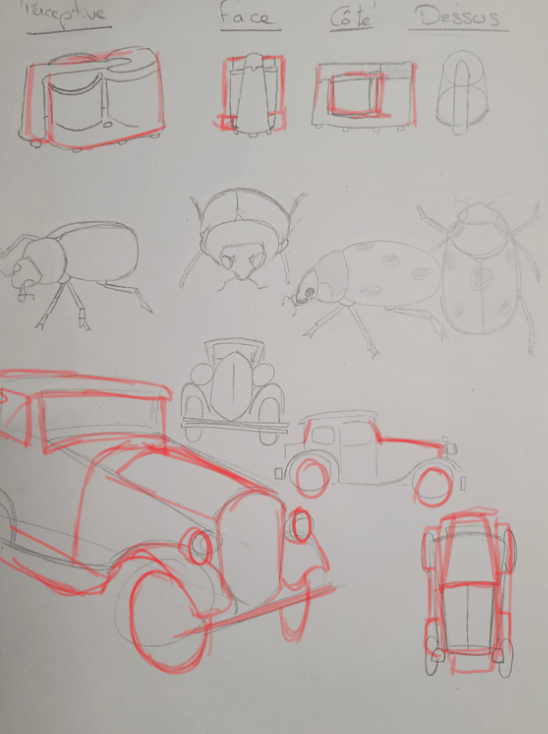 Je pense avoir du mal à représenter l'objet mentalement pour pouvoir dessiner tous les angles de vues. j'ai tenté de représenter les gardes boues pour découper le sujet. Dois-je encore plus simplifier mon croquis et ne représenter que des formes pour mieux comprendre ?