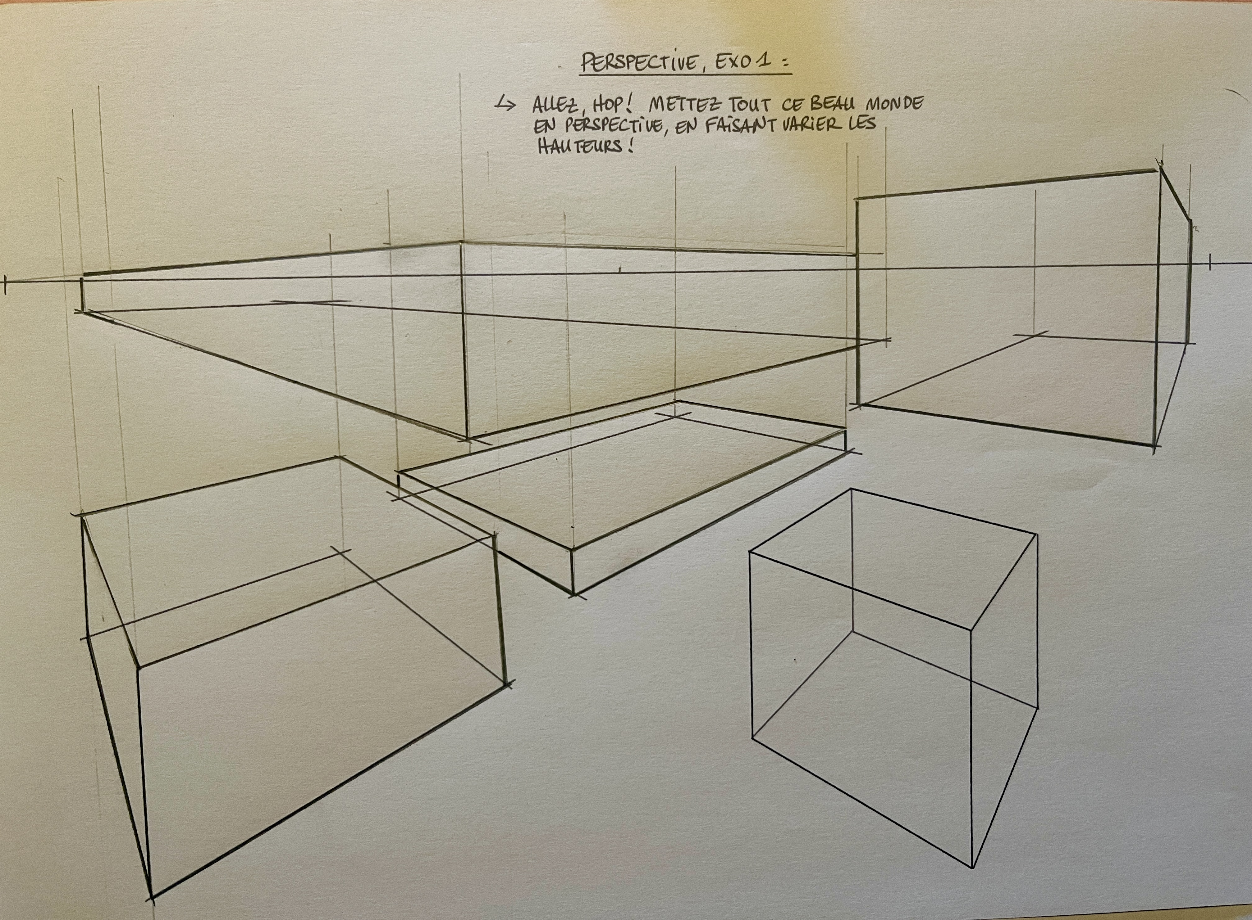Le deuxième exercice fait aujourd'hui m'a posé quelques problèmes. Je n'arrivais pas à trouver un point de fuite. J'ai dessiné un peu à l'intuition. Il va falloir que je revisionne ce cours.