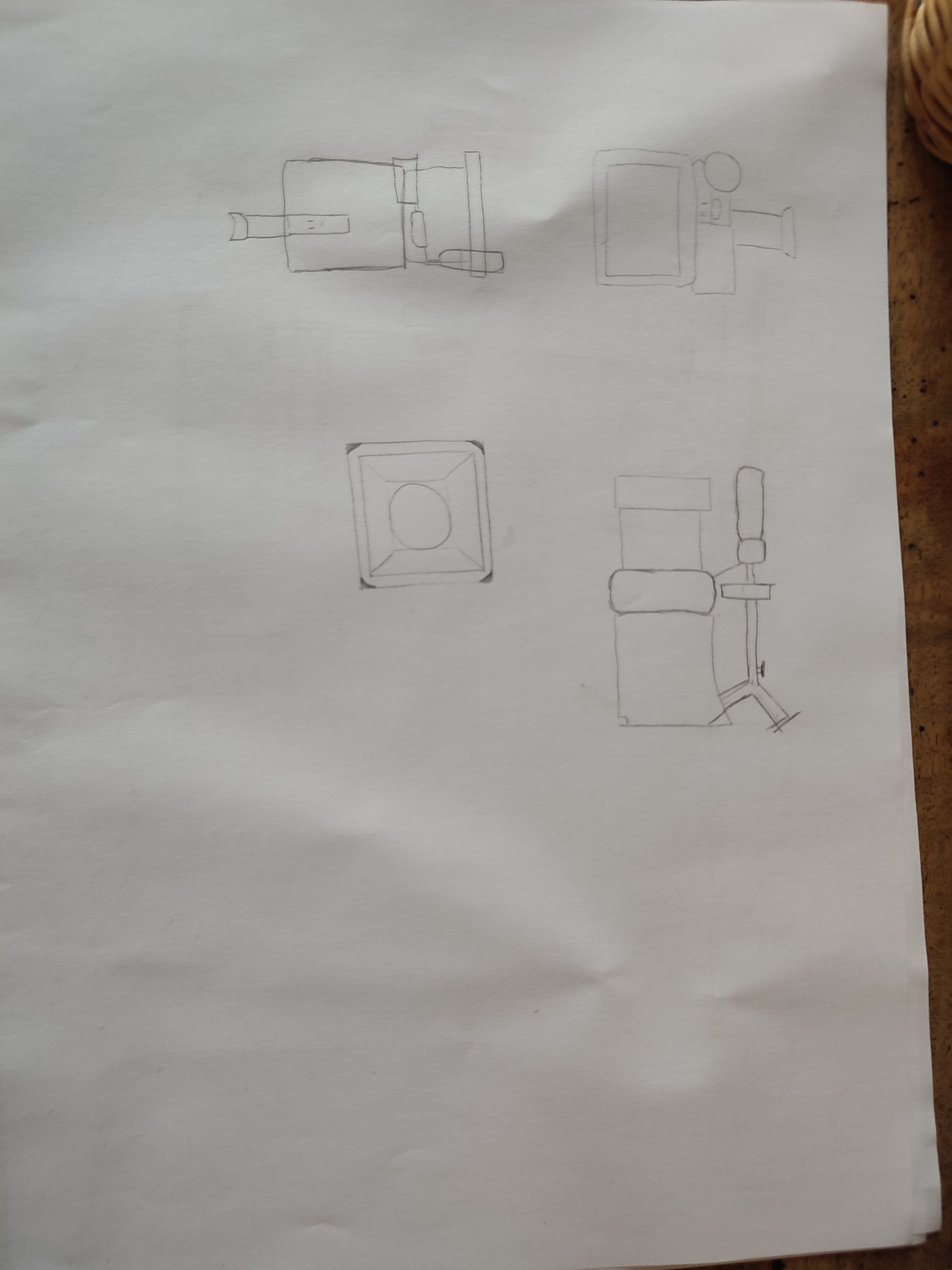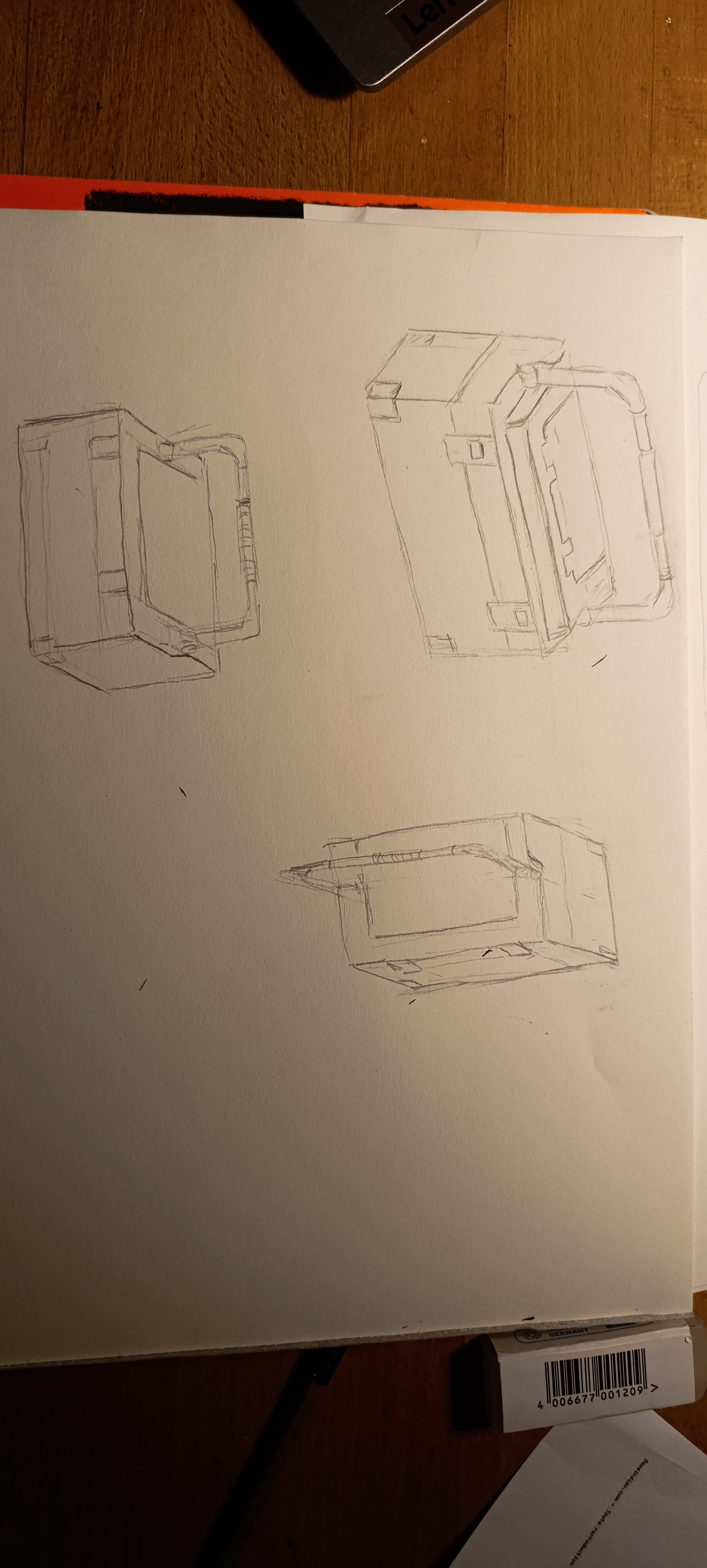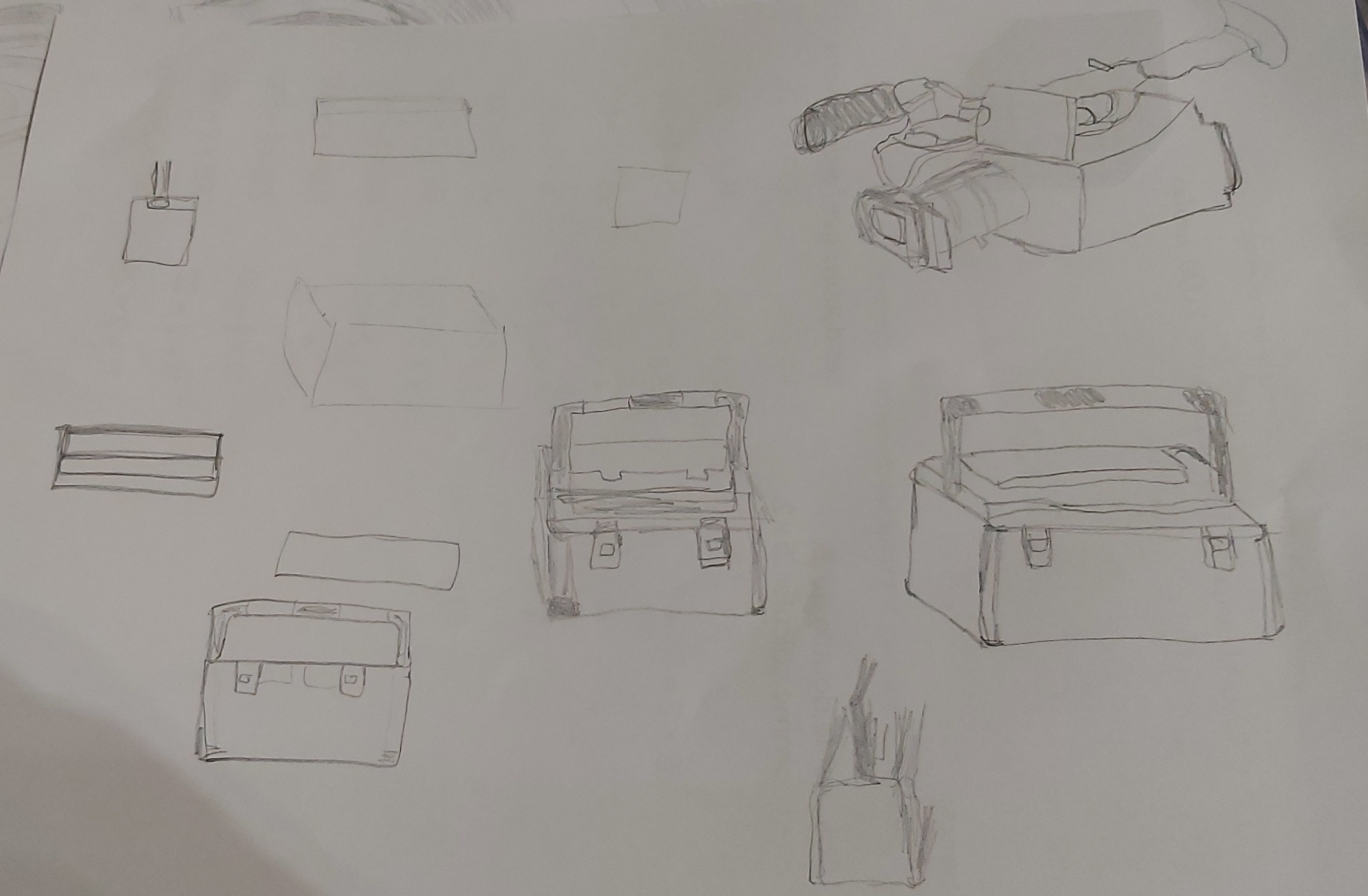 J'ai vu tes exercices, celui de la caméra ainsi que celui de la boîte à outils. Je remarque que tu as utilisé la perspective à point de fuite, ce qui est bien, bien que ce ne soit pas la seule option. Tu peux également utiliser la perspective isométrique, qui est plus appropriée pour la présentation d'objets en volume.