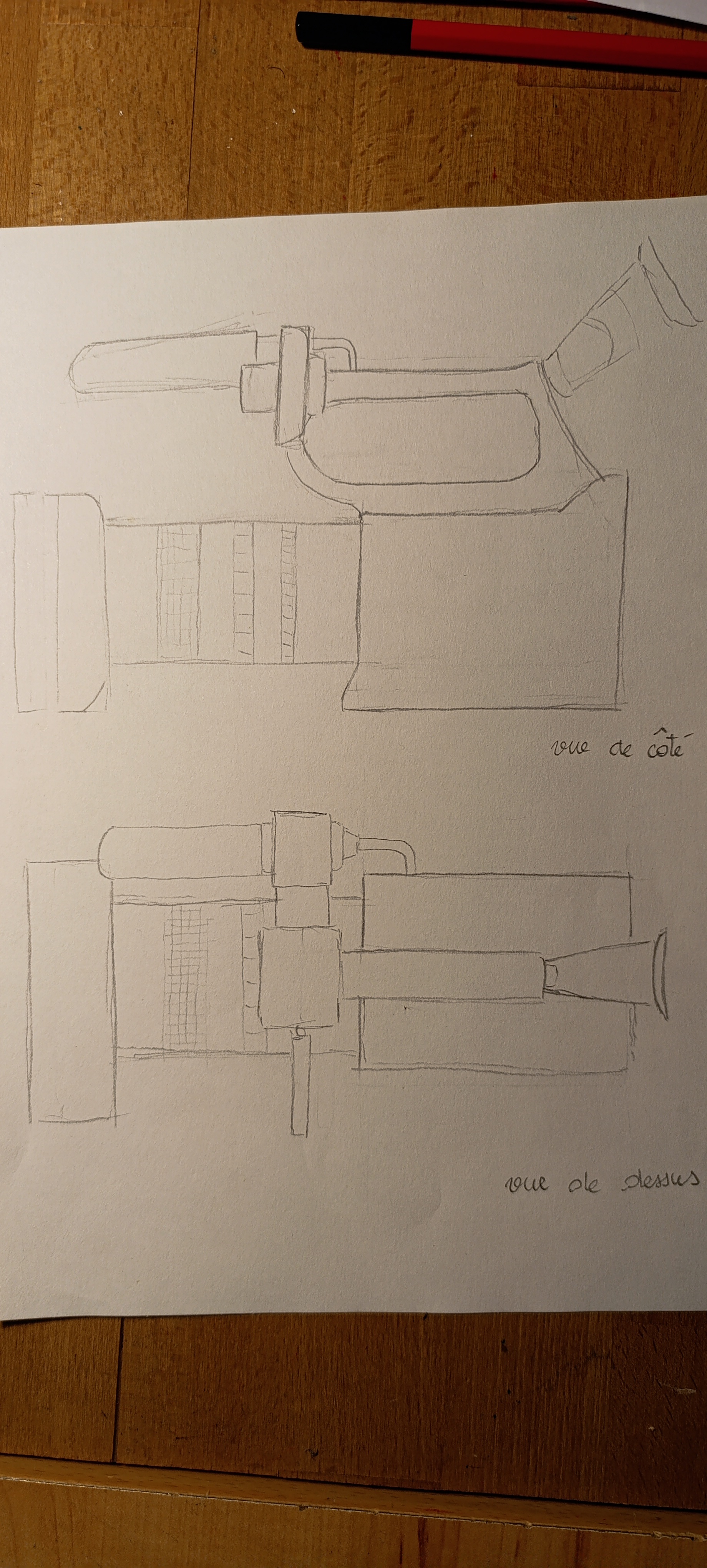 Ich habe die Übung ausprobiert, die für mich als Anfänger ziemlich schwierig war. Genug Schwierigkeiten mit den Proportionen und der Perspektive der Freihand, meine Linie kommt mir schwer vor (allerdings bin ich nebenbei von B-Bleistiften auf einen Druckbleistift umgestiegen) und ich habe den Eindruck, dass ich schon zu viele Details hinzufügen möchte ... Was halten Sie von diesem ersten Entwurf? Ich werde es basierend auf Ihren Kommentaren überarbeiten und dann vor die Kamera gehen. Vielen Dank