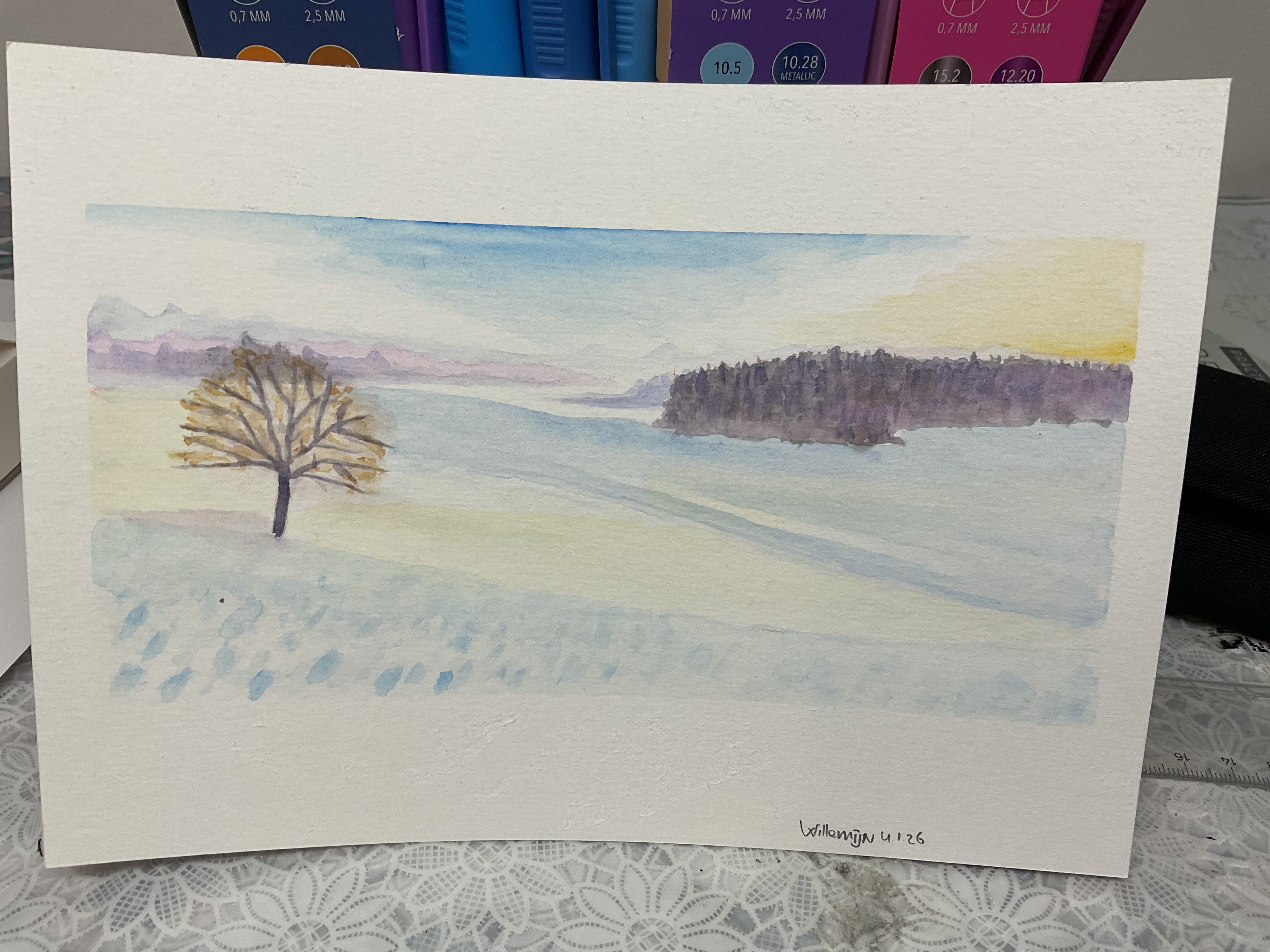 Schwierigkeiten mit dem Baum (für weiße Zweige), ich wollte nicht weiß nehmen. Ich habe das Material entfernt 😌 Ich habe zu viel gerieben und habe das Gefühl, dass ich trotz Aquarellpapier zu viel Wasser, Gondelpapier, verwendet habe.
