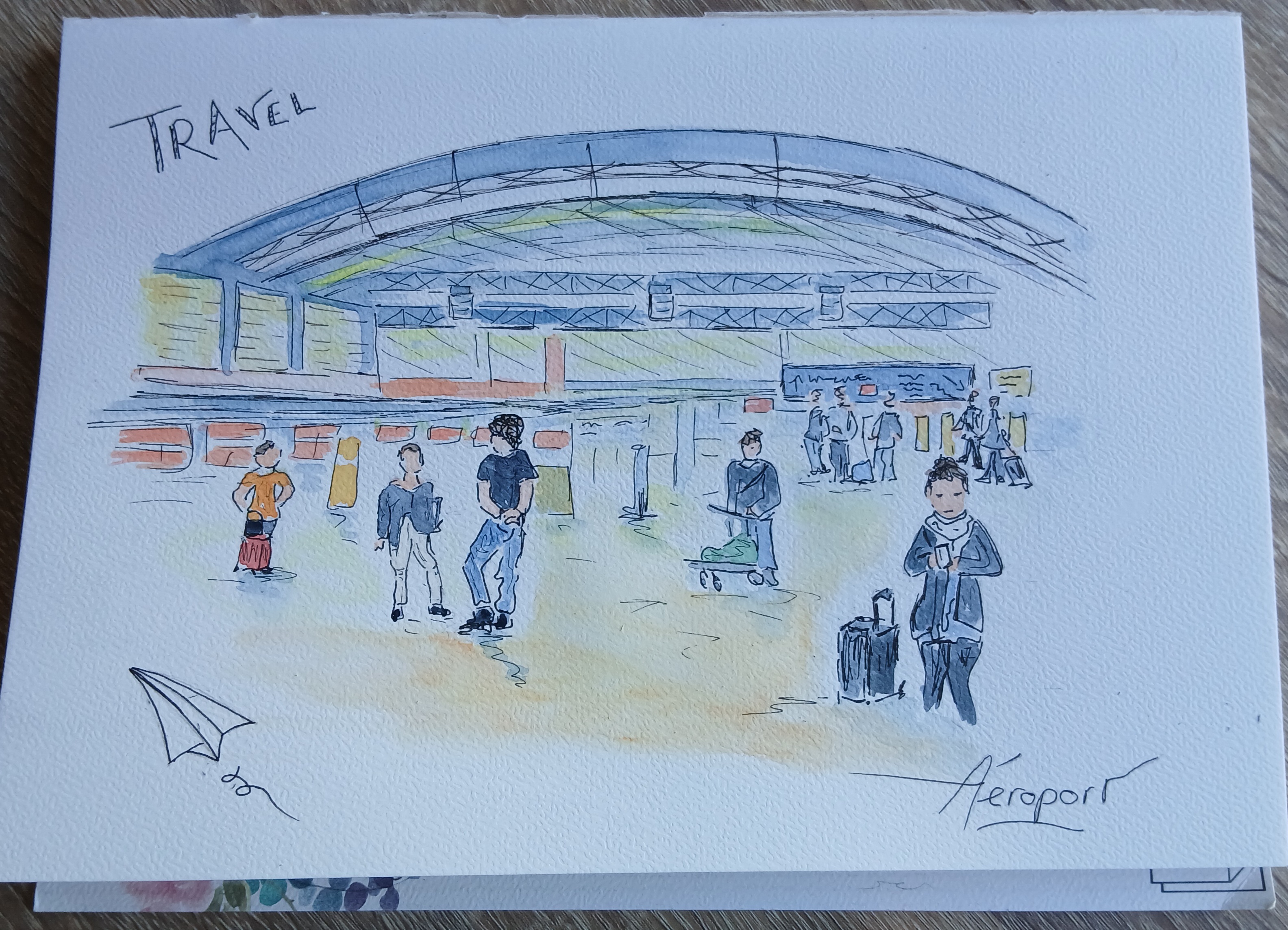 Voici mon croquis de l'aéroport. J'ai essayé d'aller le plus vite possible.. et donc pas le temps d'intégrer un détail...mais je ne lâche pas facilement prise à trop m'appliquer ...bon, le petit avion en papier sera mon detail qui passe , vite fait 😆
