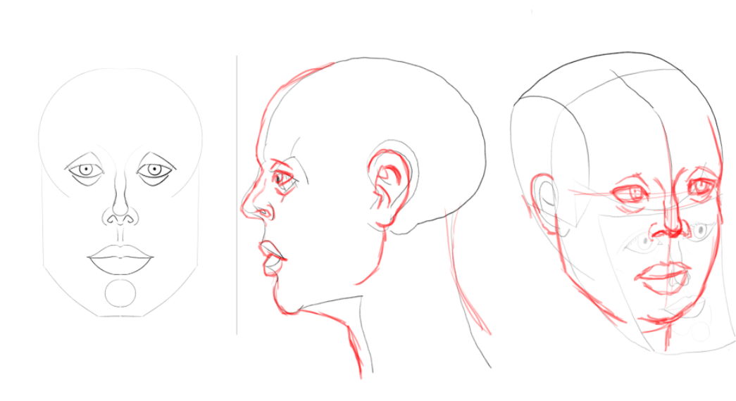Pense à bien séparer le volume de la boite cranienne du visage dans tes construction puis de bien repérer où sont les points commus des deux (proche des tempes). Construis d'avord le crâne puis ensuite le visage en te fiant à tes premières proportions. Continue 👍
