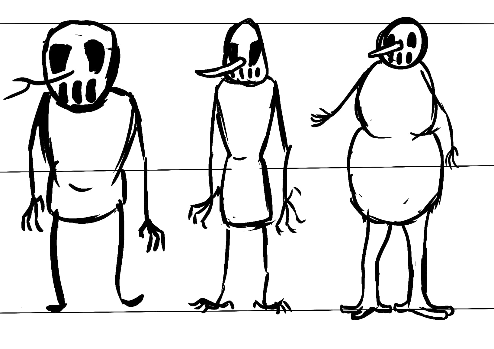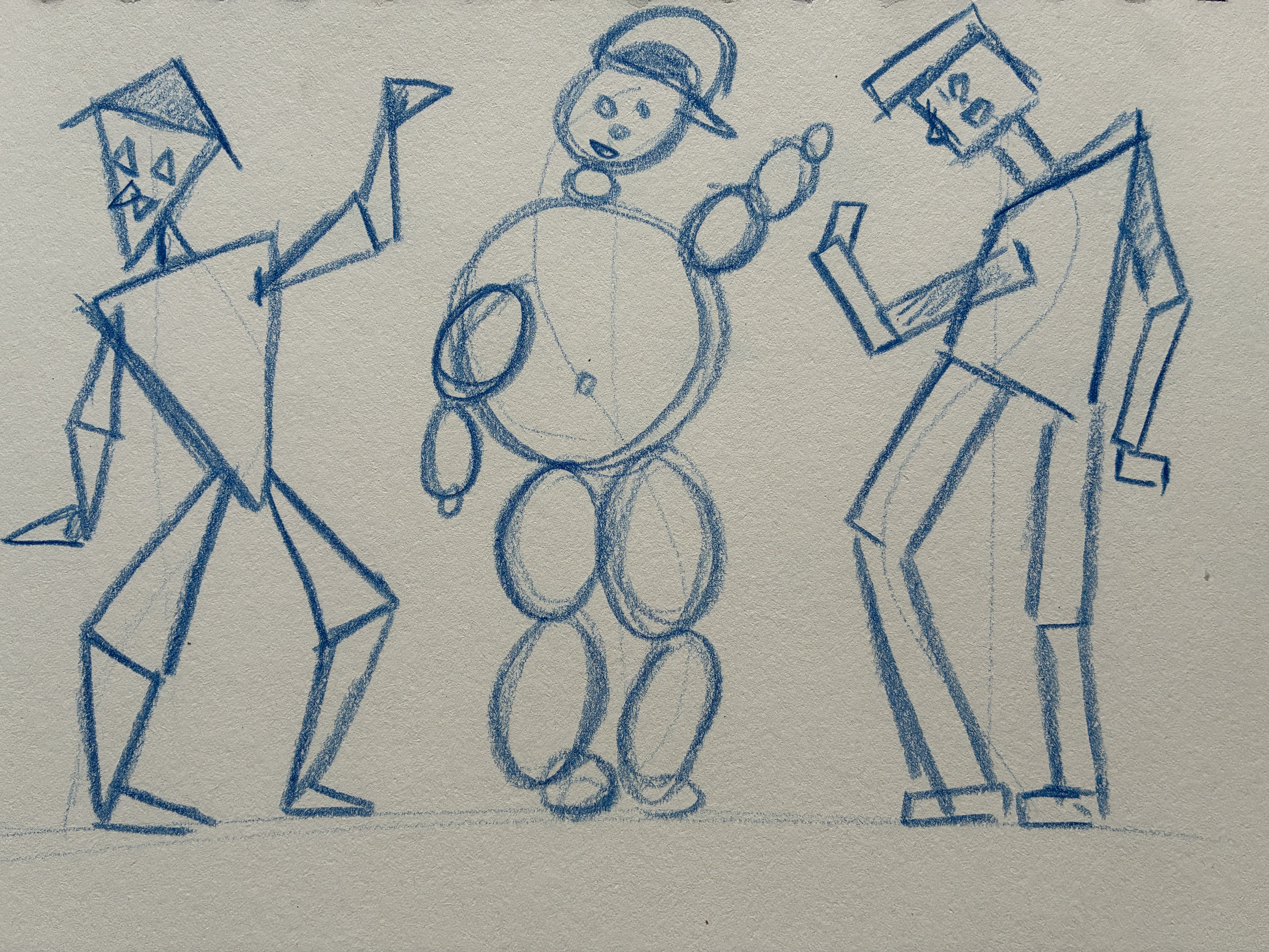 Ta proposition est très intéressante ! On y distingue déjà des identités propres grâce aux formes de base que tu utilises pour chaque personnage. Cependant, si tu souhaites un rendu encore plus percutant, je t'invite à exagérer l'intensité de ces formes et à varier davantage les dimensions.