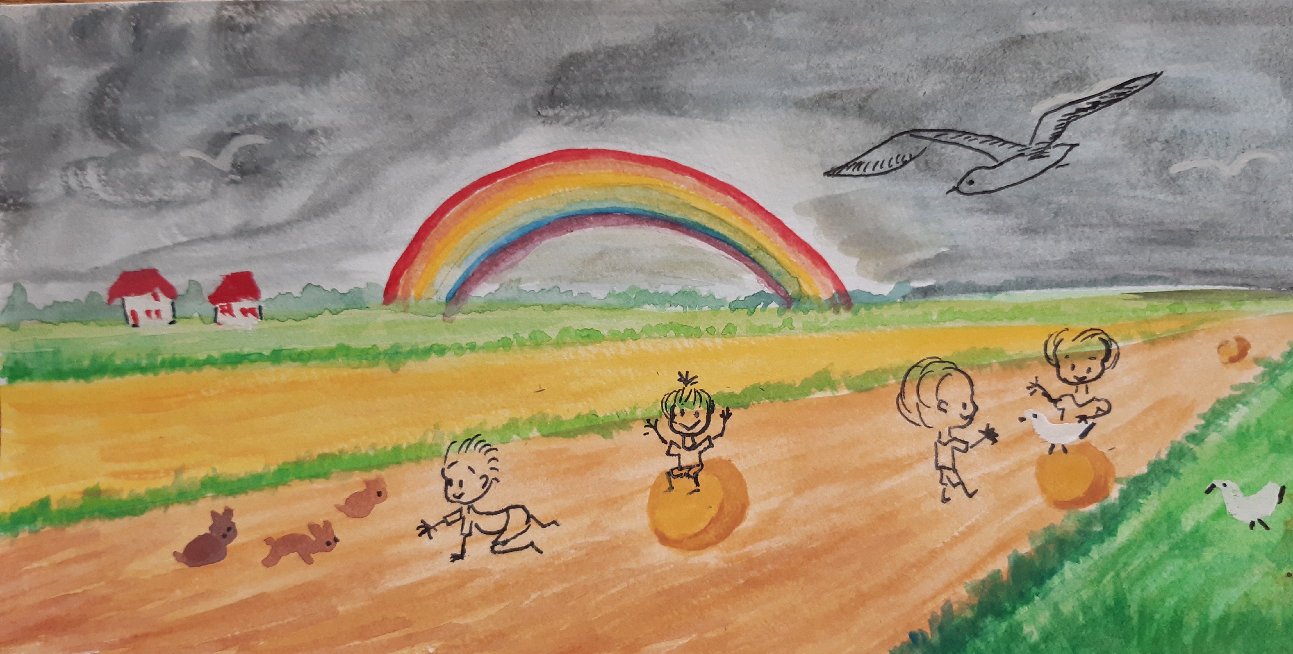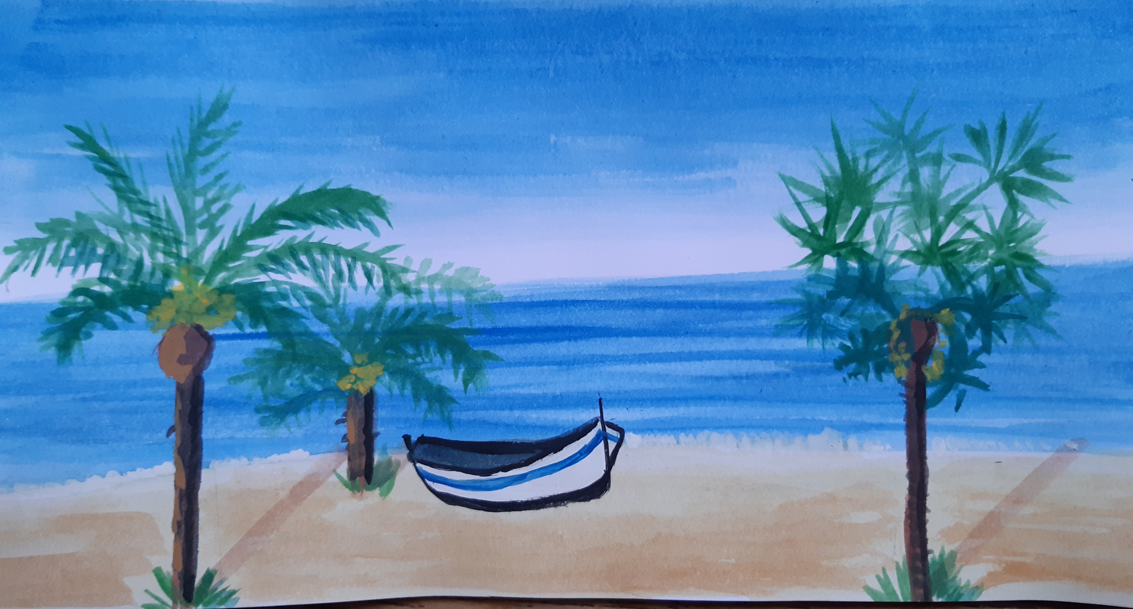 rebonjour, j'ai essayé avec les palmiers et le sol d'enrichir les couleur, merci pour toutes vos remarques, même sur l'ensemble du dessin ainsi que sur le dessin précédent, comme les tiers couleurs, dispositions... merci !