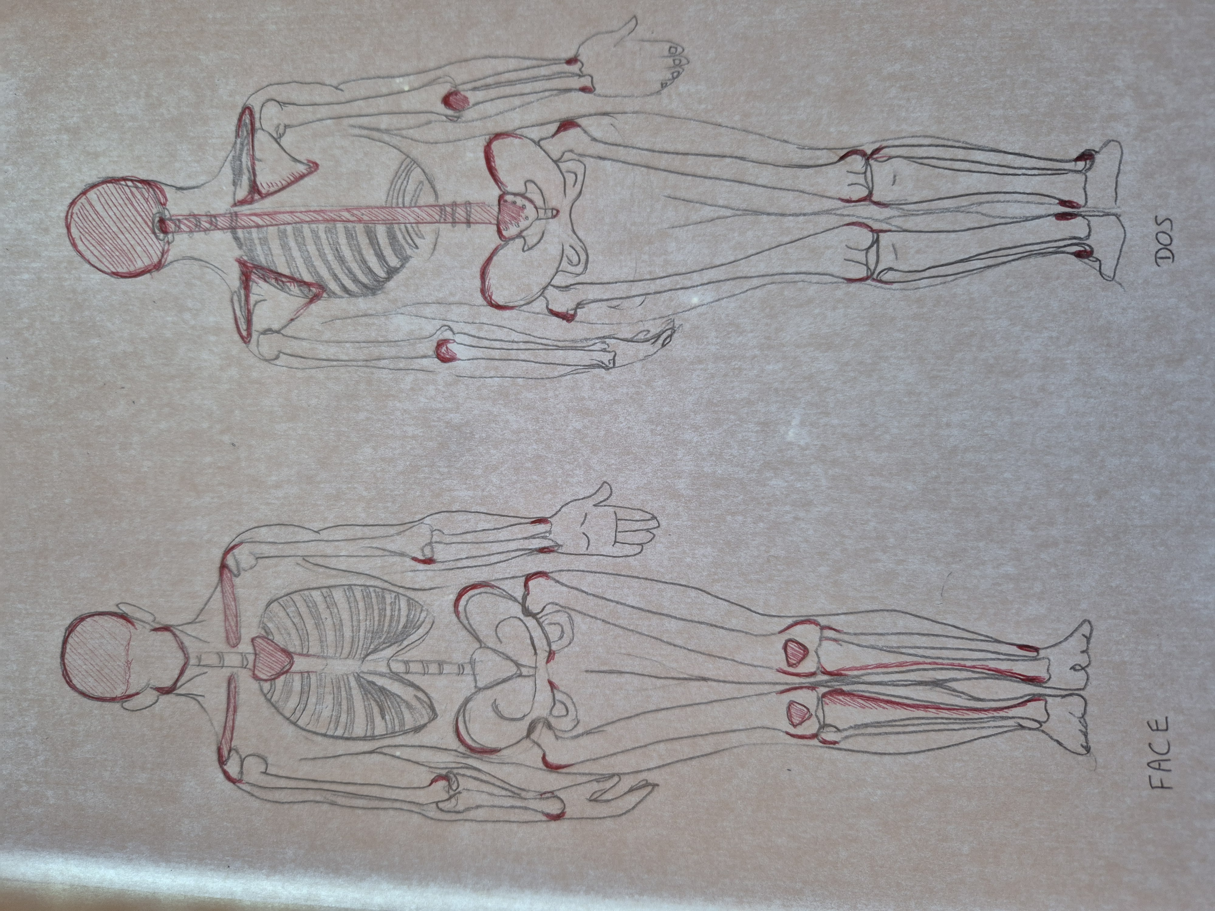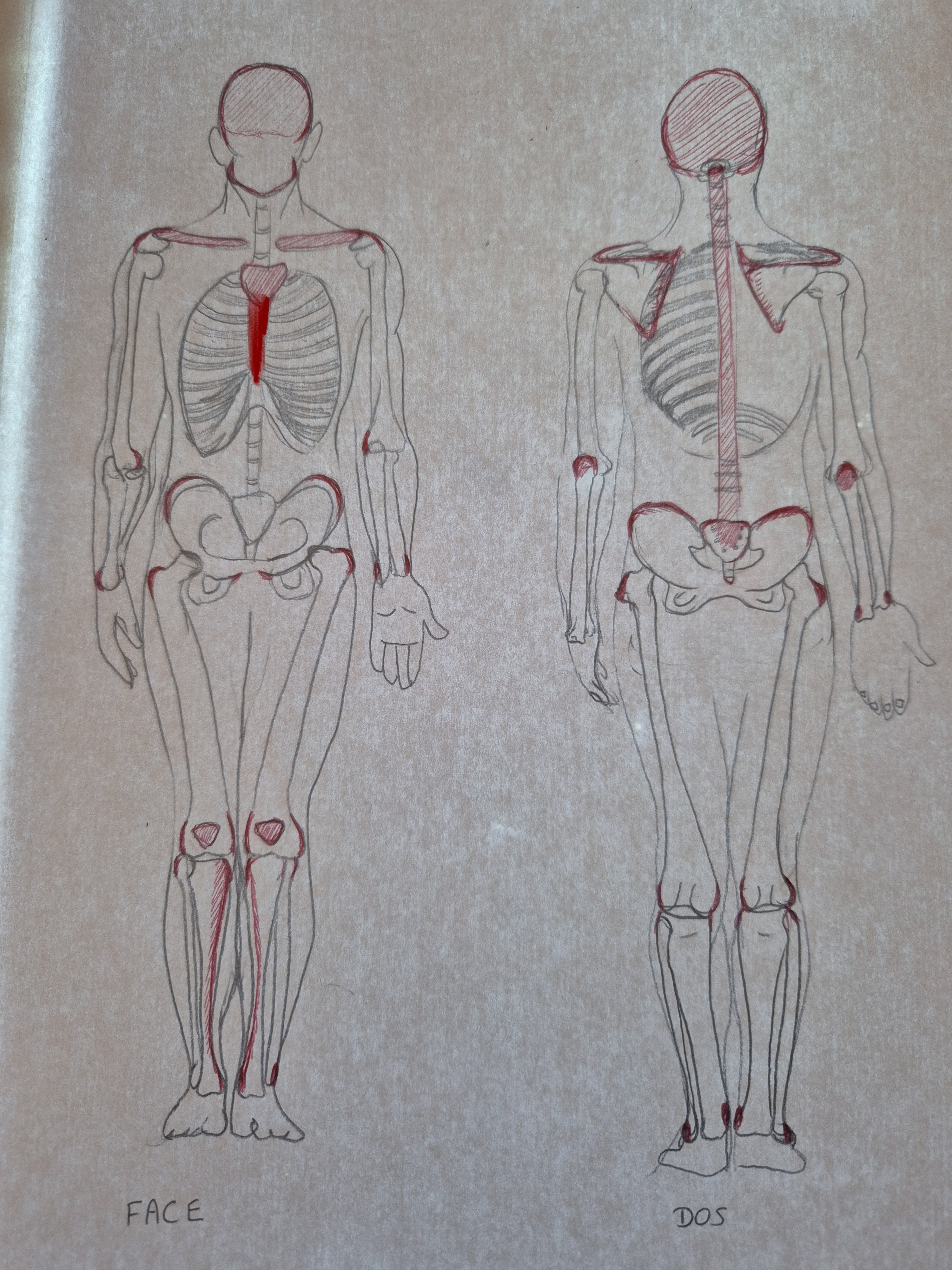 La forme des os est correcte en général, mais nous devons continuer à travailler sur la qualité du trait. Cela te permettra de réaliser des diagrammes plus clairs, en utilisant des valeurs et des intensités différentes selon le plan ou l'importance de chaque élément.
