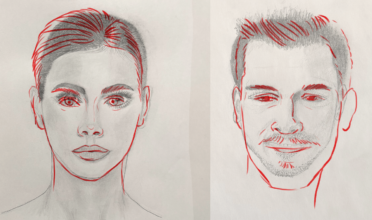 I will share with you the correction of your portraits. As you can see, there is indeed a substantial improvement on the second one; you managed to better capture the proportions and features. I therefore recommend that you continue this type of study, because only practice will refine your vision.