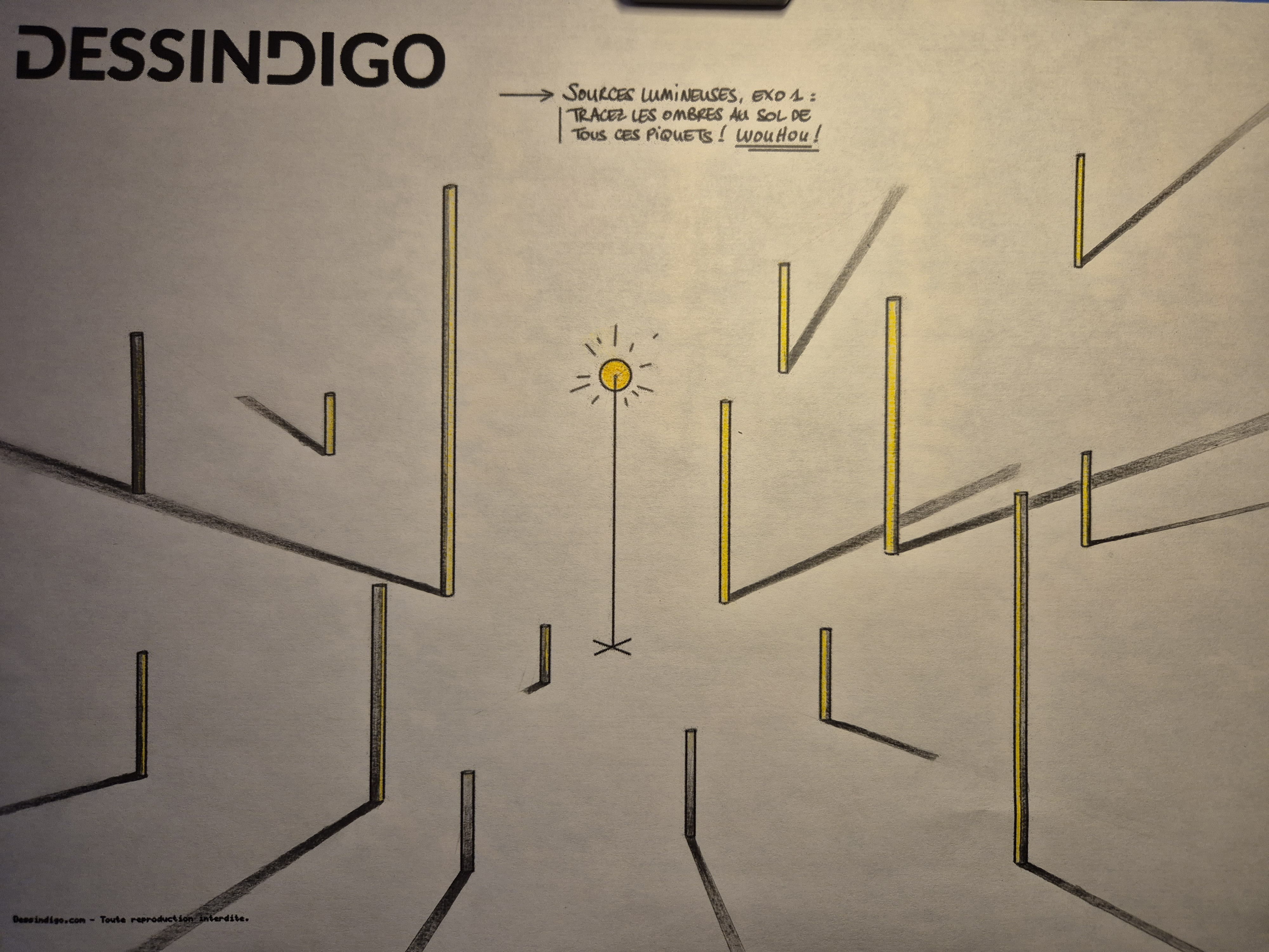 Bonjour, voici mon exercice ! Les ombres, ça a été sans trop de soucis, par contre j'ai essayé de trouvé les faces éclairées de chaque piquet, et là, c'était un peu plus compliqué ! Dans l'ensemble ça a l'air d'aller, mais je pense qu'il y a quelques petites fautes