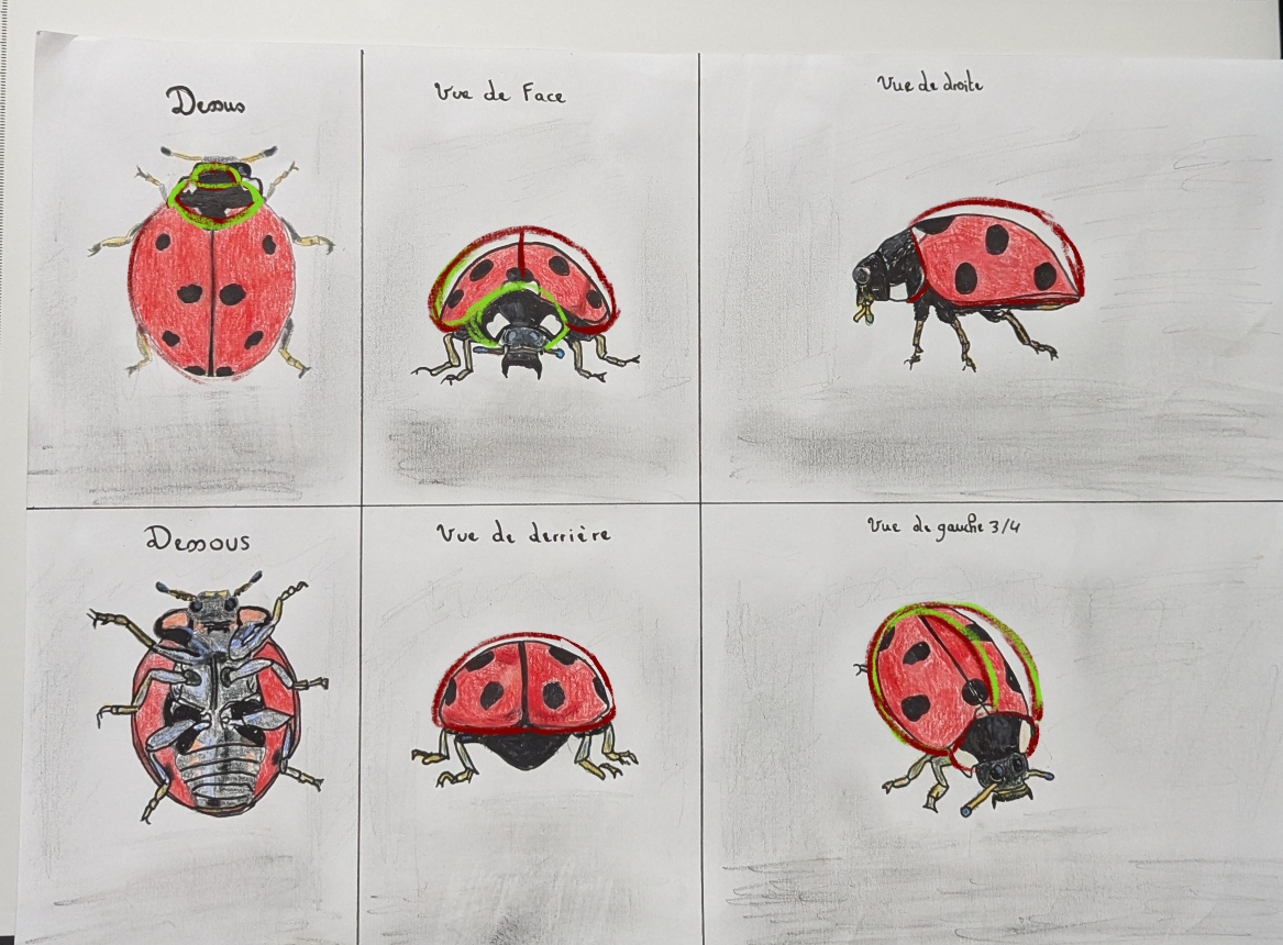 C'est plutôt un bon départ, même si tes coccinelles manquent un peu de rondeurs surtout sur la vue de face qui est très anguleuse. Les pattes sont aussi un peu trop longues, notamment en vue de profil :) N'hesite pas à les synthétiser avec des formes de base (cercle...) pour te servir de guide quand tu les dessine :)