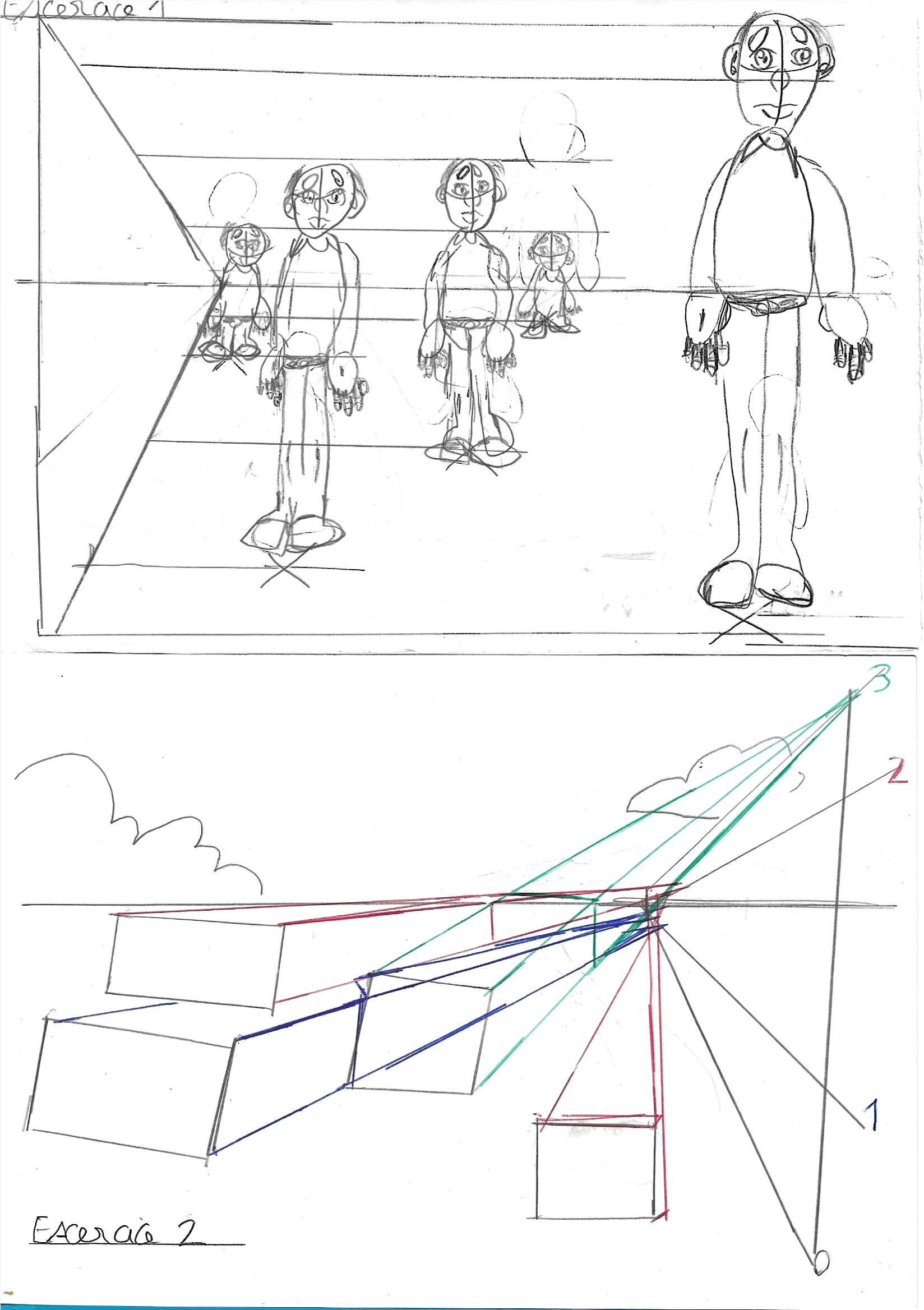 I'll share with you some corrections to your exercises. In the first we can see that the change in scale not only makes the characters shorter, but smaller in all dimensions. In the second, it is important to project the lines from the center and draw our cubes with perfectly straight lines.
