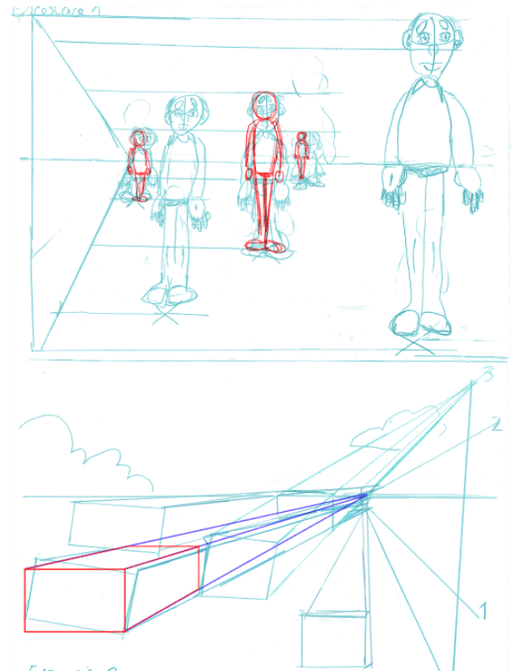 Je te partage quelques corrections de tes exercices. Dans le premier, nous pouvons voir que le changement d'échelle ne rend pas seulement les personnages plus courts, mais plus petits dans toutes leurs dimensions. Dans le second, il est important de projeter les lignes depuis le centre et de dessiner nos cubes avec des lignes parfaitement droites.