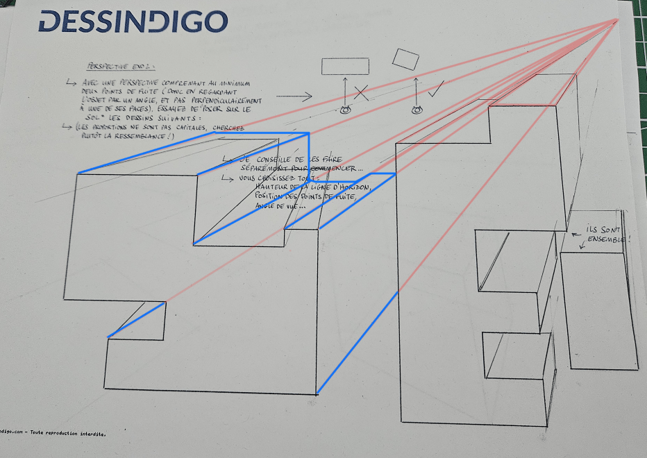Je te partage des corrections de ton exercice. Je vois que tu n'as mis qu'un seul point de fuite, nous allons donc projeter toutes les lignes vers la même origine.