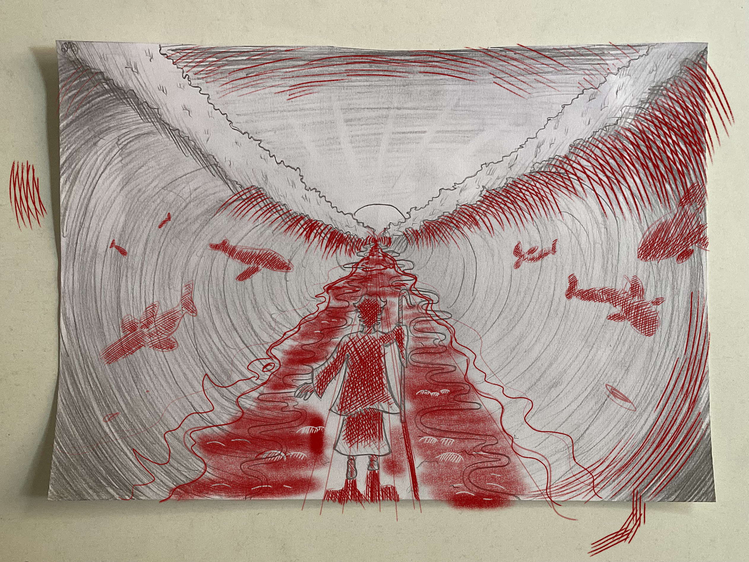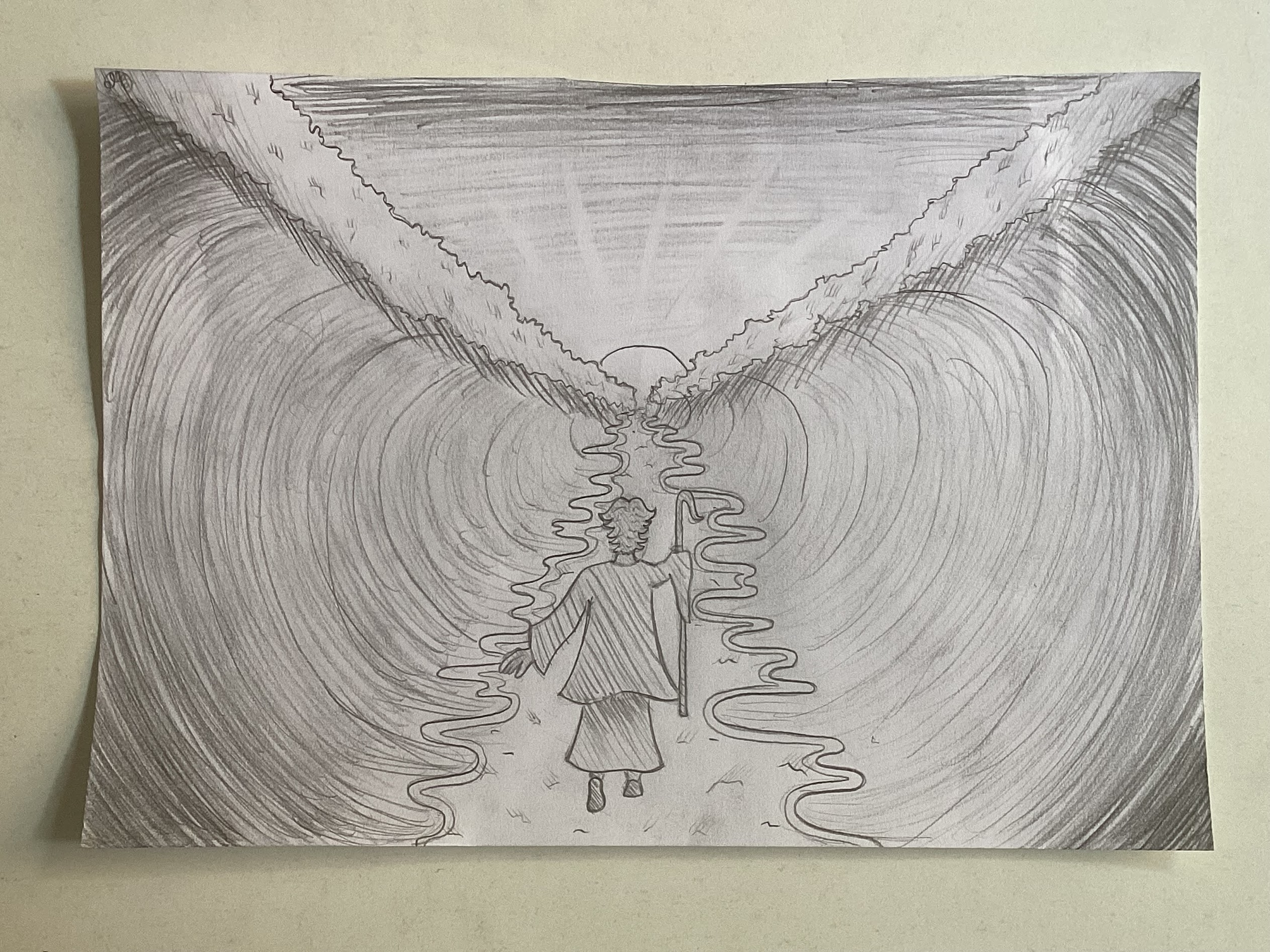 Hello Isaiah, great drawing! Not easy for hatching work... I already think that from a perspective point of view, there is the possibility of accentuating the gigantic side by widening the path opened by Moses in the waters. This being against the light, you can strongly accentuate the hatching and also add a shadow cast on the ground. Now regarding the hatching itself, there are several types (straight, curved, symmetrical or not, textured, etc.) it's up to you to choose what will best correspond to the desired result. It is also possible to add hatched shadows of fish and sea creatures that can be seen through the waves. As for the ground, I think it can be very darkened, even blackened, with scattered puddles, and some algae and corals to complete the composition. On a very dark ground, it is possible to work the hatching in negative (white line on black background). In short, there are many interesting things to see and test on this type of drawing and composition! A great job regardless! ^^