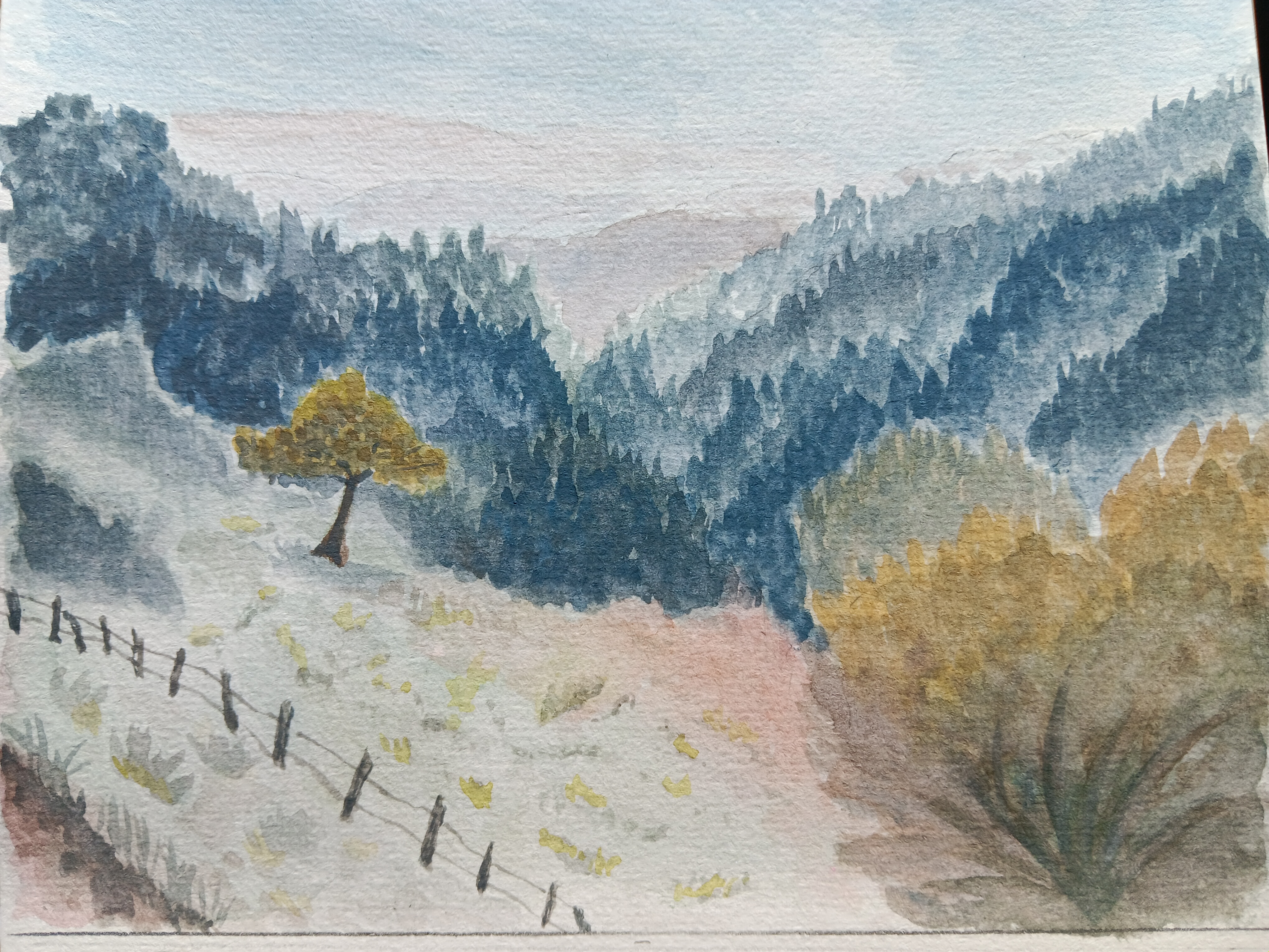 What a charming watercolor! The colors you have chosen and the presence of white generate a feeling of calm, although the inclination of the foreground suggests to me a visual weight that you could avoid in your next pieces.