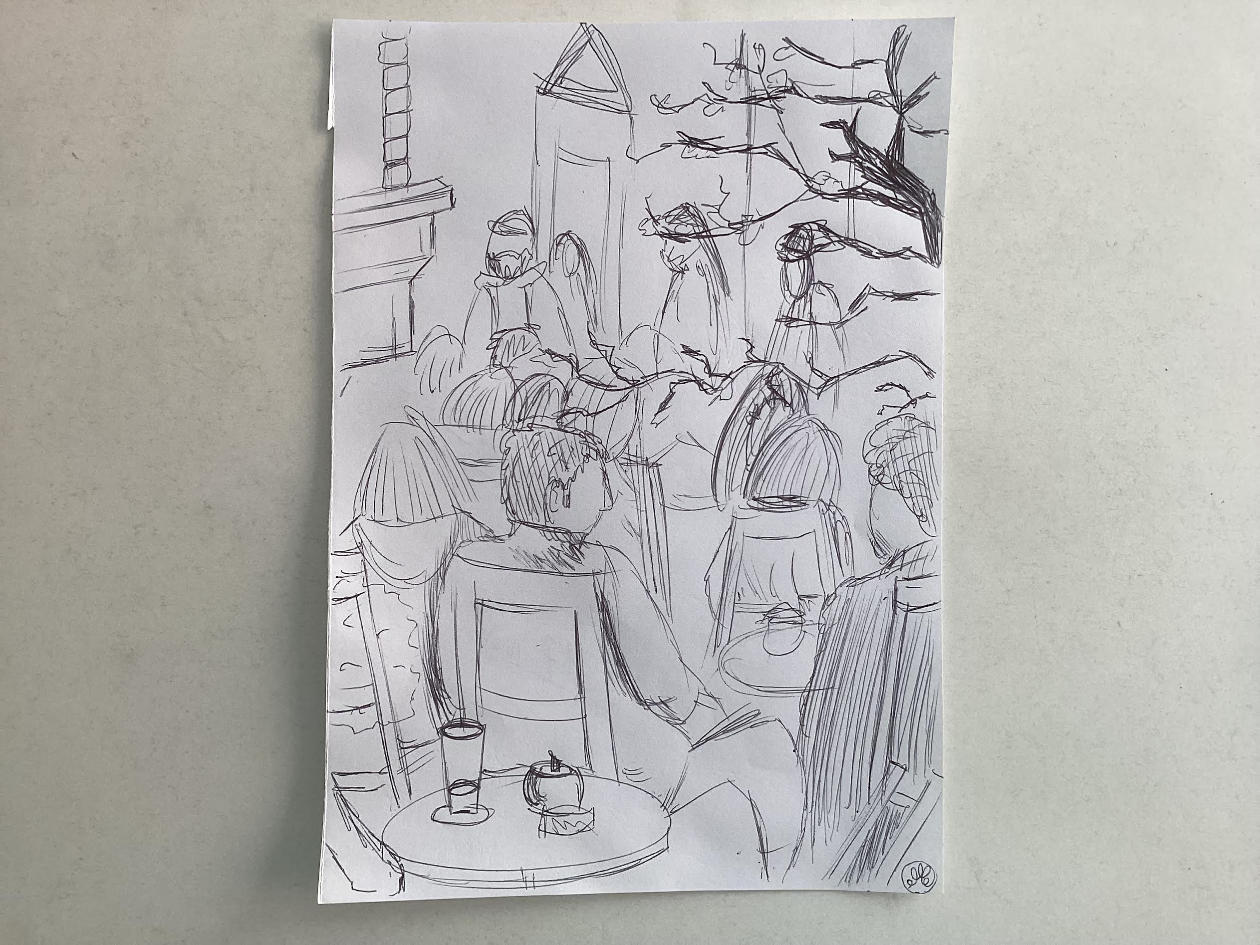 Tes esquisses sont vraiment bien, il y a peut être un petit détails à revoir sur les chaises de la 1ere qui paraissent un peu plate. Bien joué 👍