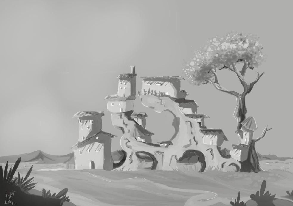 To improve your piece, I recommend that you integrate a gradient into the background and some clouds to give atmosphere to this scene. I also suggest that you project the shadow of the structure onto the ground.