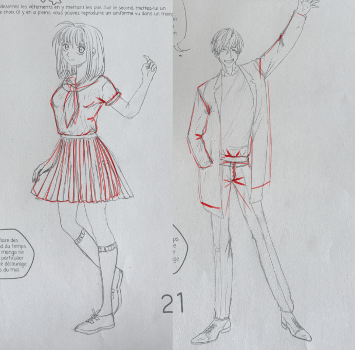 Sur tre dessins par exemple, pour la femme, il manquait d'un grand plis qui viennent suggérer la poitrine, mais les autres n'etaient pas indispensable. Sur l'homme c'est les plis au niveaux de l'aine qui étaient un peu maladroit, en général dans ces zones là (comme les aisselle, l'aisne, le plis du coude...) les plis convergent tous les uns vers les autres.