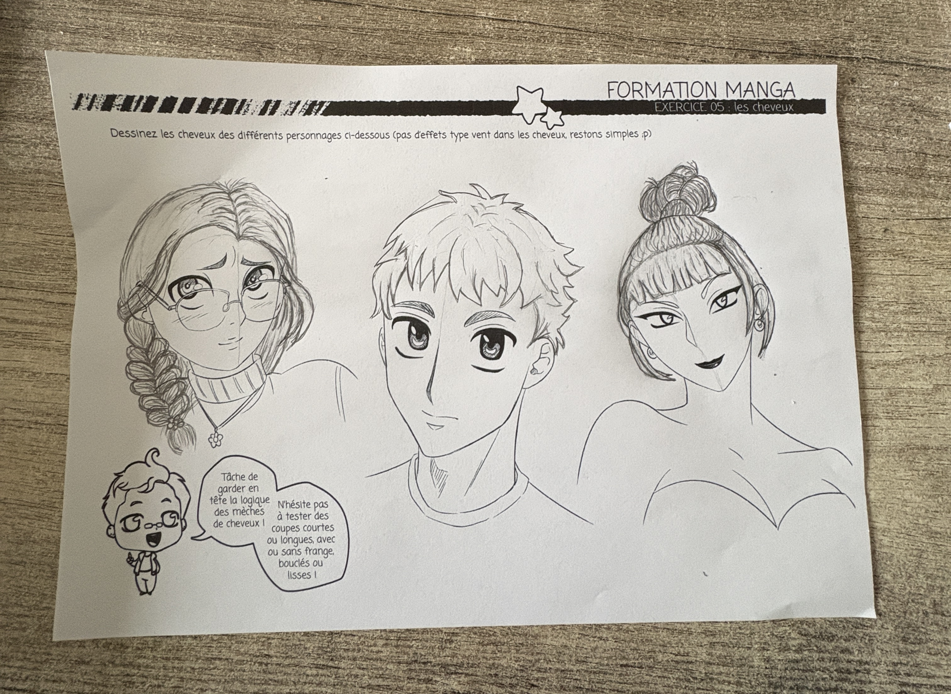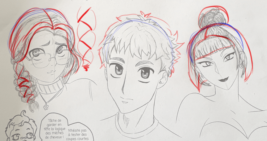 Je partage avec toi quelques corrections et commentaires sur les cheveux de tes personnages : je te recommande d'essayer de varier l'épaisseur de tes traits pour donner du dynamisme à chaque tracé. Je te conseille également d'utiliser des lignes incomplètes pour suggérer la forme de chaque mèche, en imitant les reflets et les ombres de manière simple.