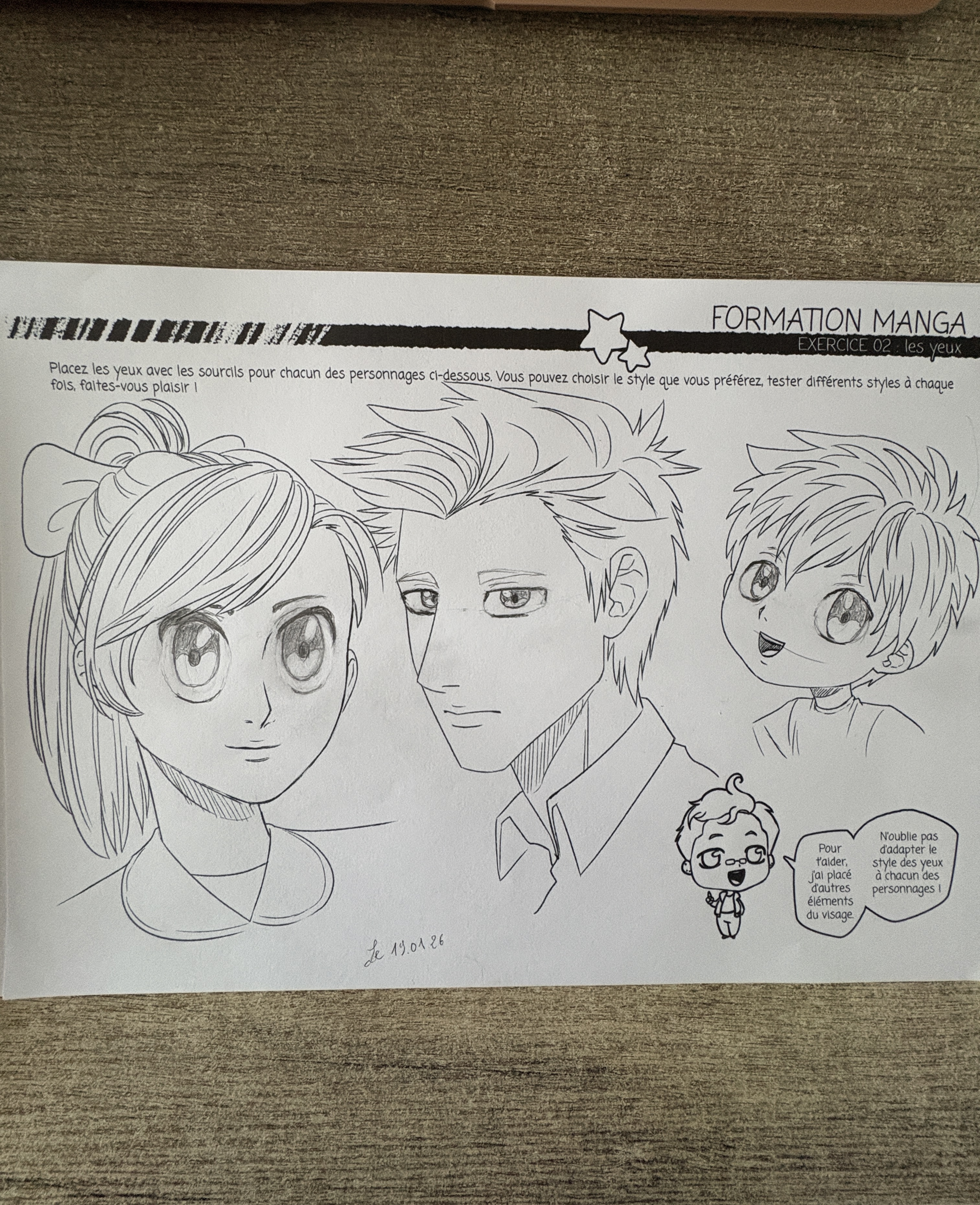 Tes yeux sont bien placés sur leurs modèles respectifs, et ils sont globalement très réussis avec des traits sûrs et détaillés. Cependant, je te recommande de veiller à une échelle plus adaptée pour chaque modèle. Par exemple, les yeux de la jeune fille sont très grands ; comme le style est très expressif, ils finissent par être un peu trop imposants. En revanche, les yeux de l'enfant sont bien proportionnés.