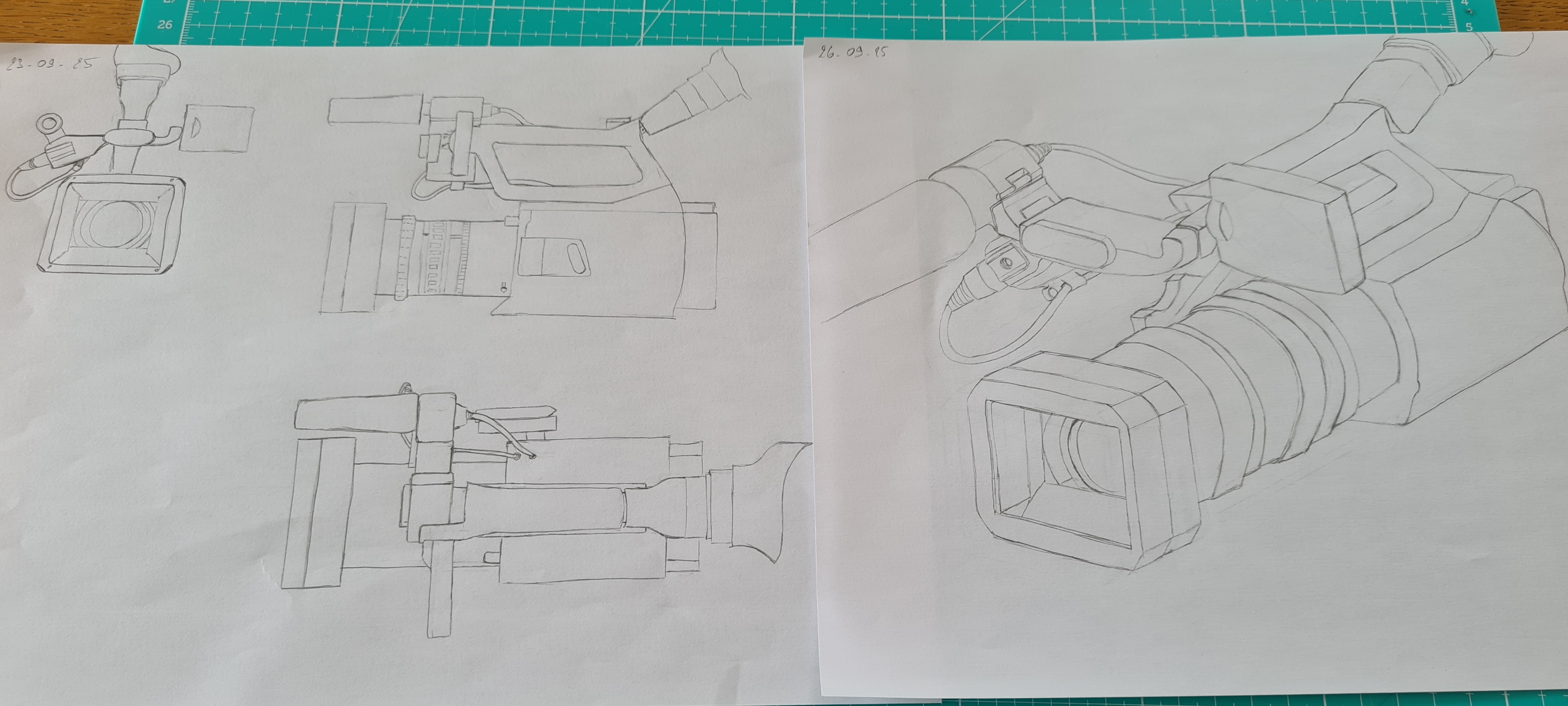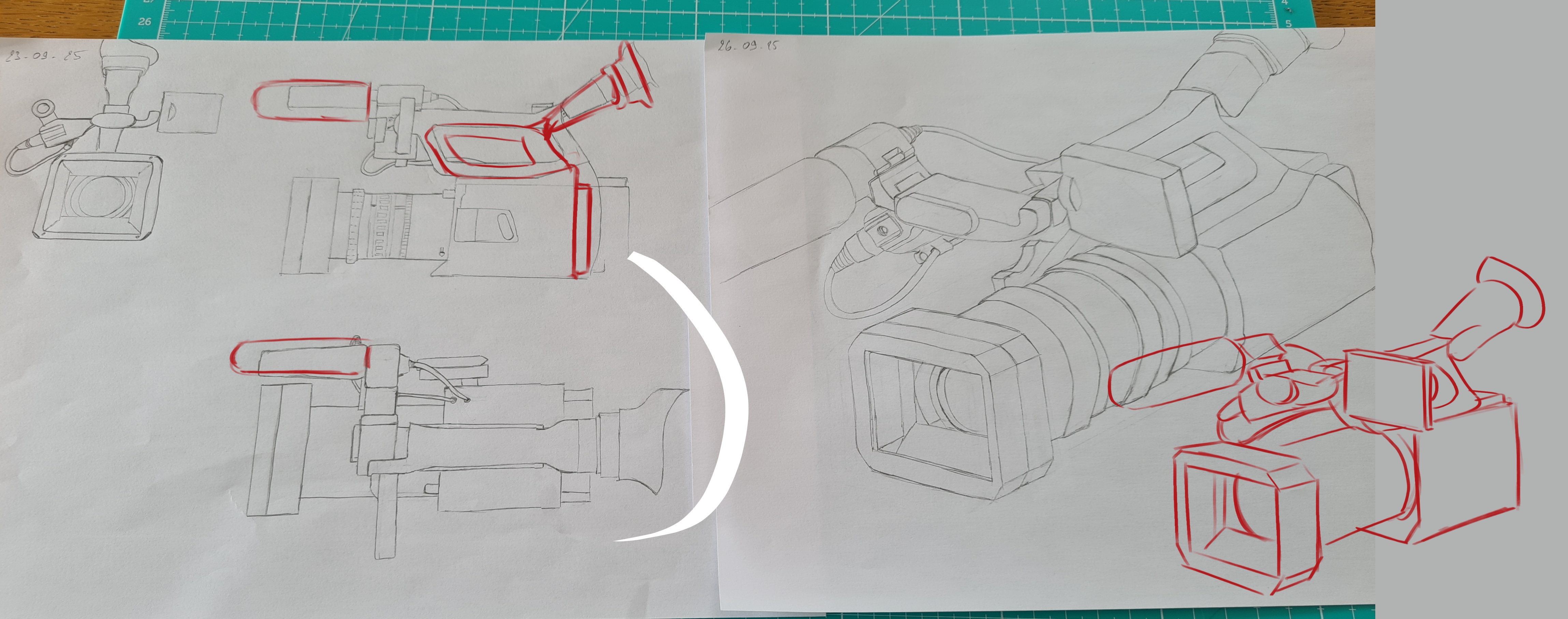 concernant tes dessins, ils sont vraiment très propre dans l'ensemble. Tu as une ligne très précise, c'est très agréable à regarder :) le principal point qui revient c'est que tu as globalement fait les caméra trop allongées, ça se voit surtout sur celle en vue de 3/4. Elle a aussi tendance à un peu piquer du nez, surtout au niveau du micro, mais dans l'ensemble, surtout avec la quantité de détail que tu as reproduit, c'est vraiment réussit, bravo 👌👍