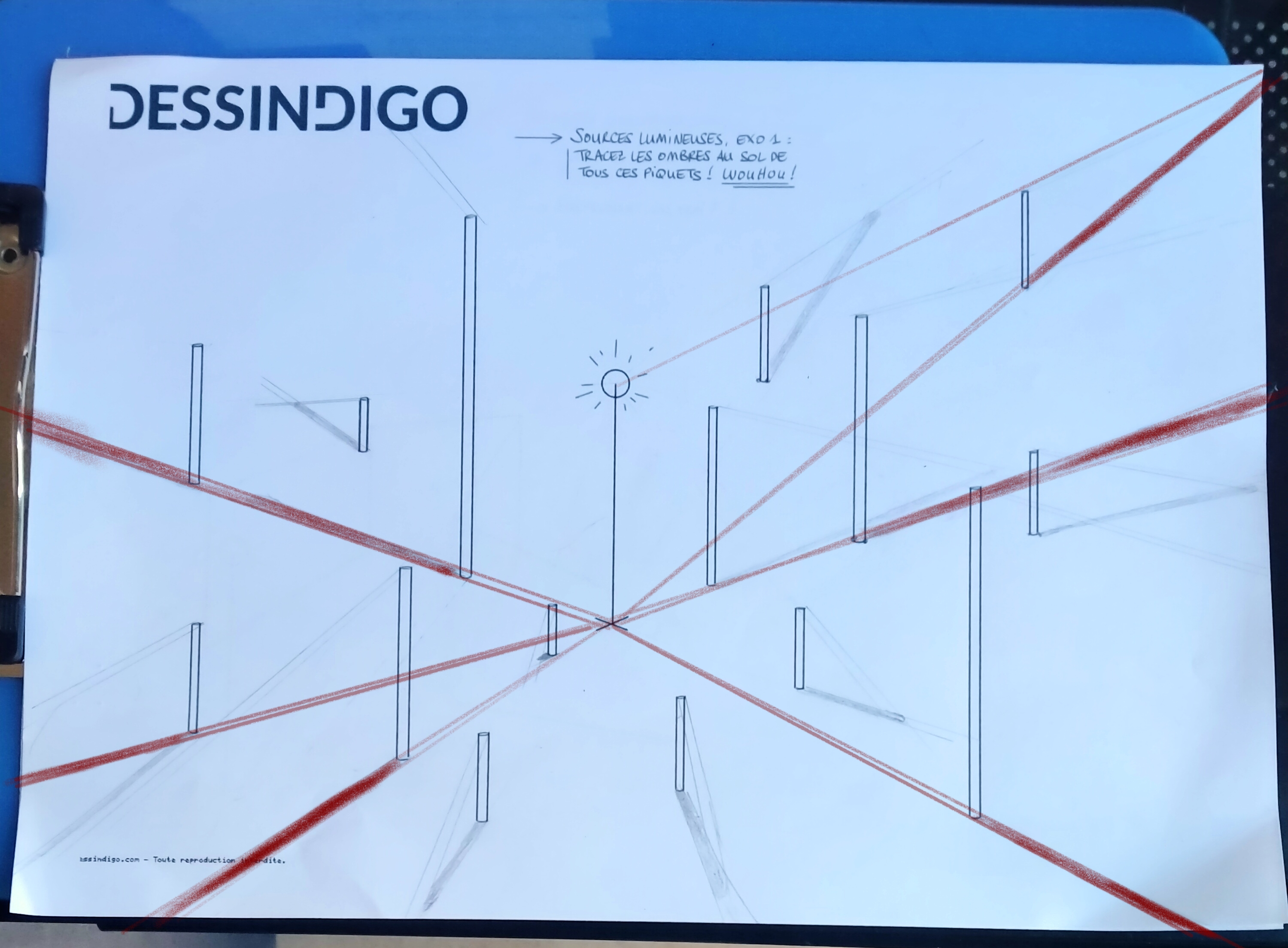 Dans l'ensemble tu as totalement compris le concept de l'exercice 👍 Deux petites choses pour l'améliorer encore : au niveau de la forme des ombres, utilise une droite de repère qui part du sommet de l'objet pour bien définir la forme de son ombre porté, et ensuite je te conseil d'estomper légèrement les ombres plus elle s'eloigne de la base, cela ajoute de la profondeur :)