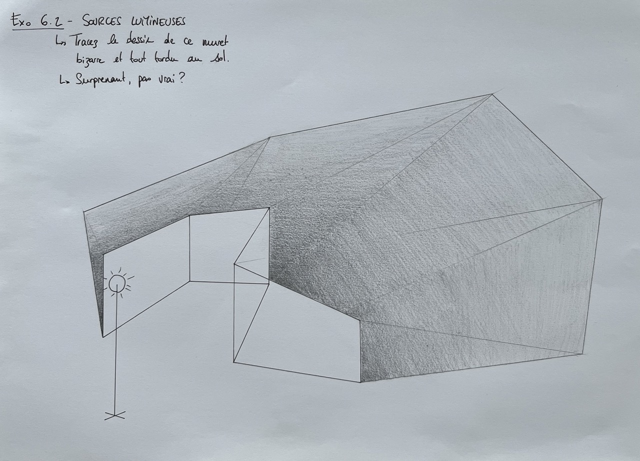Ton exercice est très bien ! Tu as correctement suivi les lignes de référence pour projeter les ombres, c'est un point positif pour toi ! De plus, l'utilisation de différentes intensités d'ombre donne une touche stylistique qui rend l'intensité du contraste encore plus claire. Excellent !