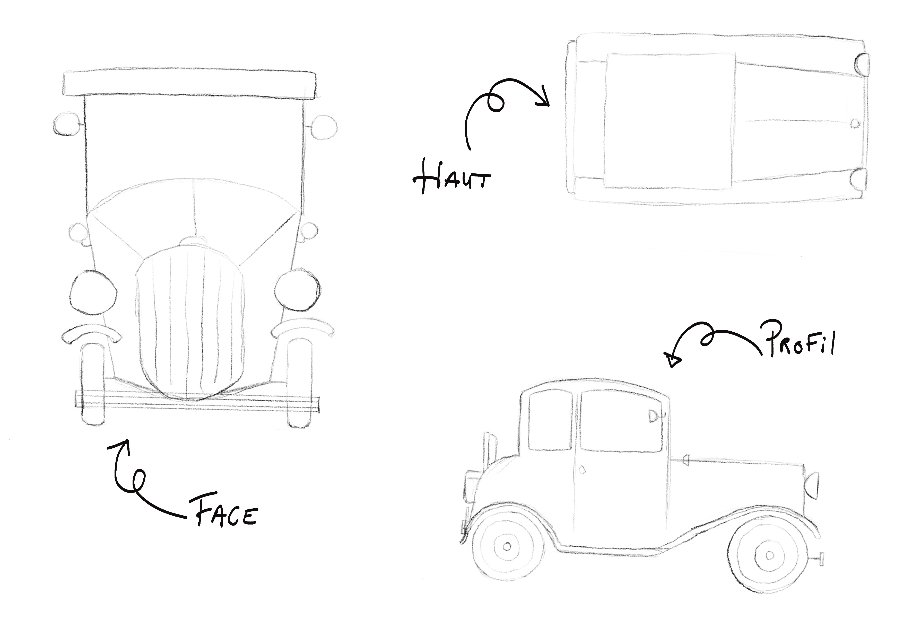 Je pense avoir du mal à représenter l'objet mentalement pour pouvoir dessiner tous les angles de vues. j'ai tenté de représenter les gardes boues pour découper le sujet. Dois-je encore plus simplifier mon croquis et ne représenter que des formes pour mieux comprendre ?
