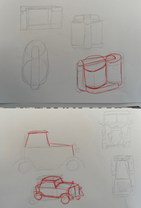 Je te partage quelques ajustements sur la vue en perspective de tes modèles. Tu pourras remarquer comment tu peux utiliser des formes de base pour simplifier les volumes et éviter les déformations.