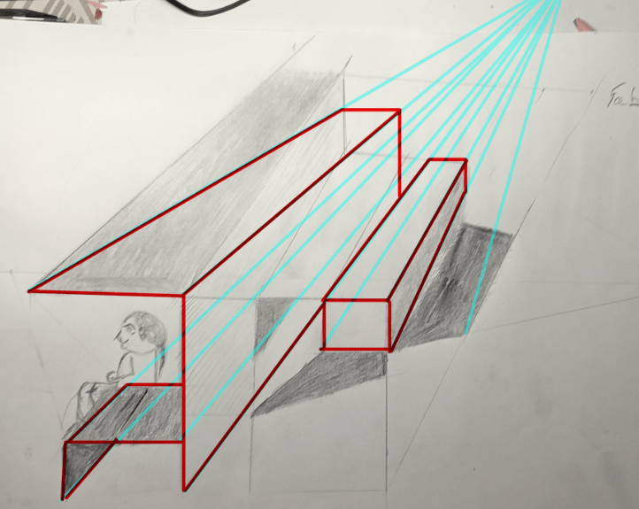 Te comparto una corrección de la perspectiva de tu dibujo. Observa como todas las líneas convergen hacia un único punto a distancia: esto es lo que le da coherencia a nuestro dibujo.