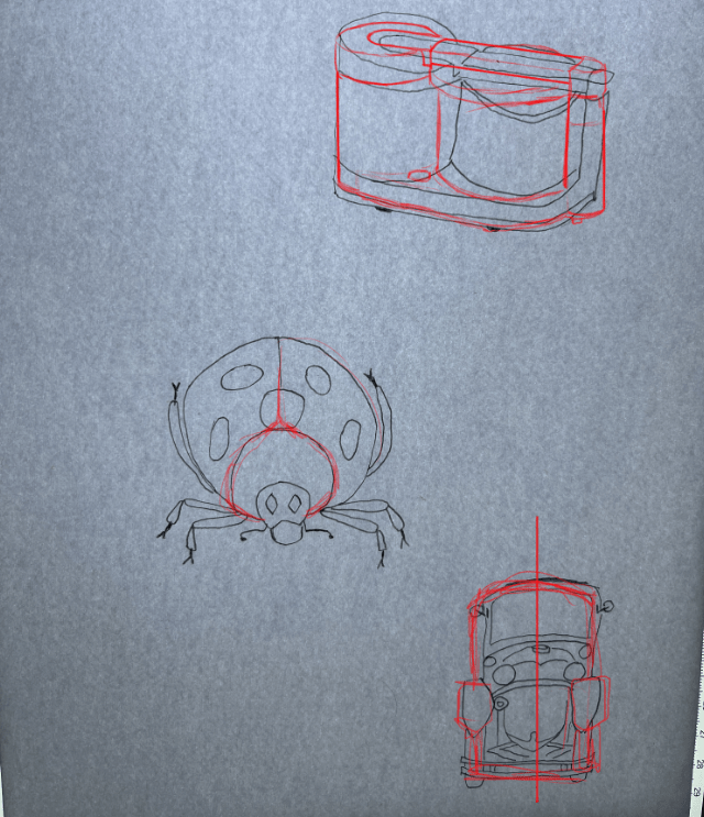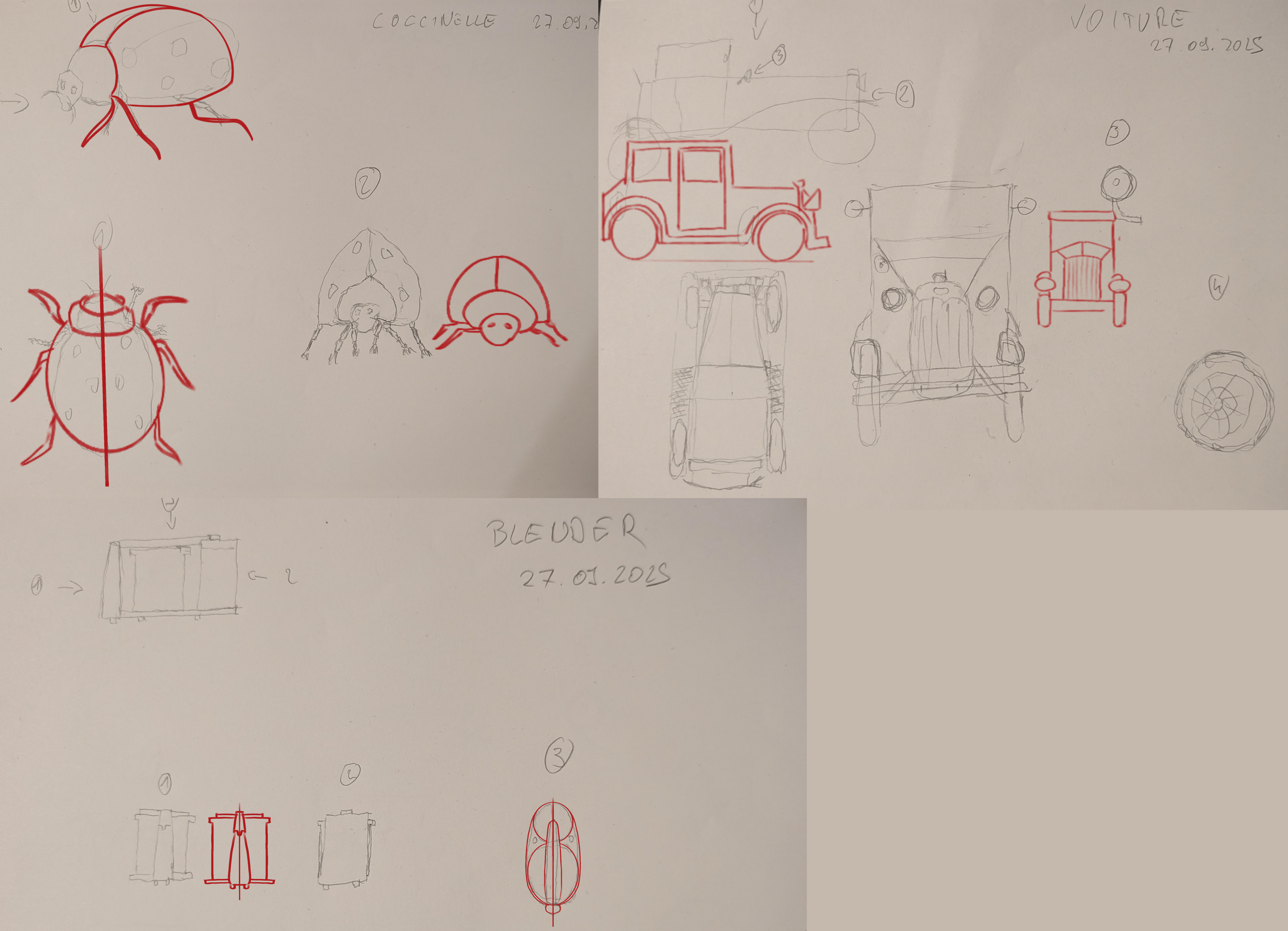 En general, ¡realmente no está mal, especialmente si no has estado dibujando por más de 30 años! Entonces, sí, sentimos un poco que su línea está oxidada, pero mejorará rápidamente :) Ha logrado capturar las proporciones de los diferentes modelos, el principal problema que se destaca es la falta de simetría, es particularmente visible en el robot y el automóvil. No dude en rastrear una línea de simetría en estos casos para tratar de distribuir bien en ambos lados :) Para la mariquita en general, carecía de un poco de redondez y en la vista desde el frente es demasiado alto.