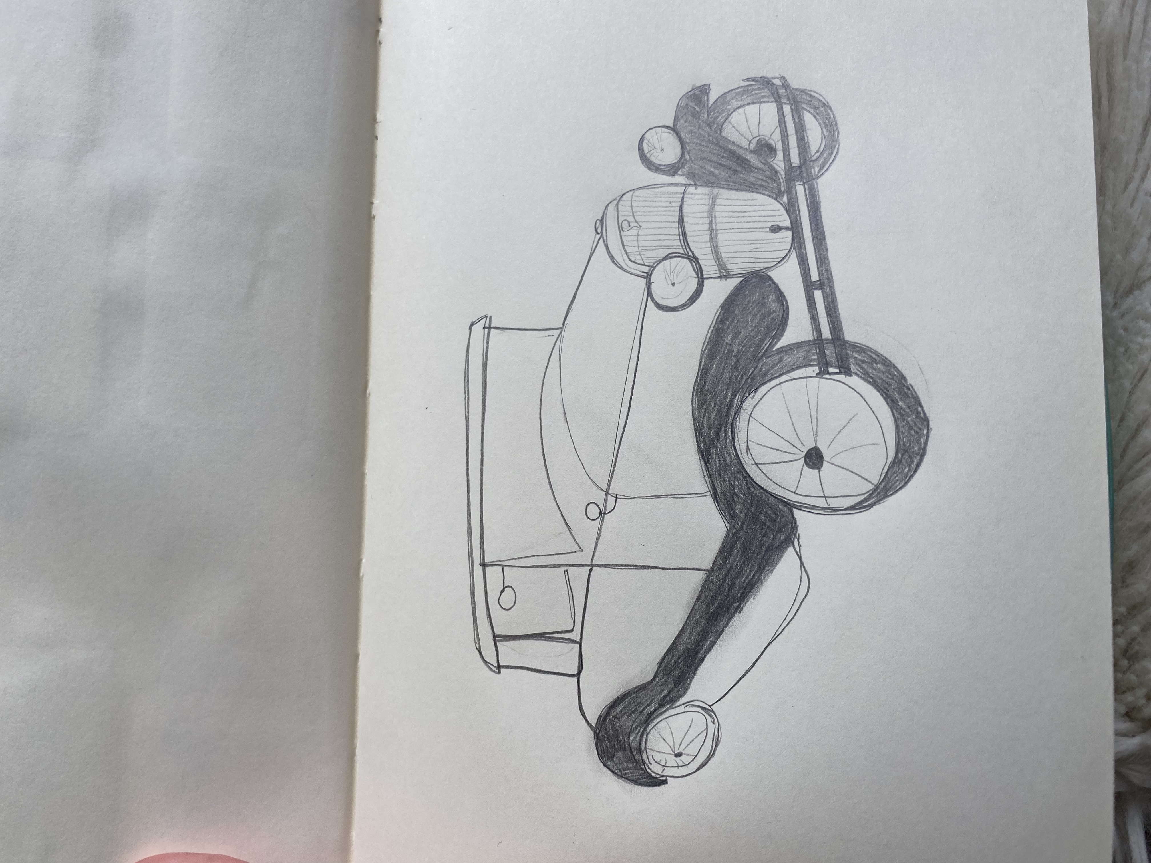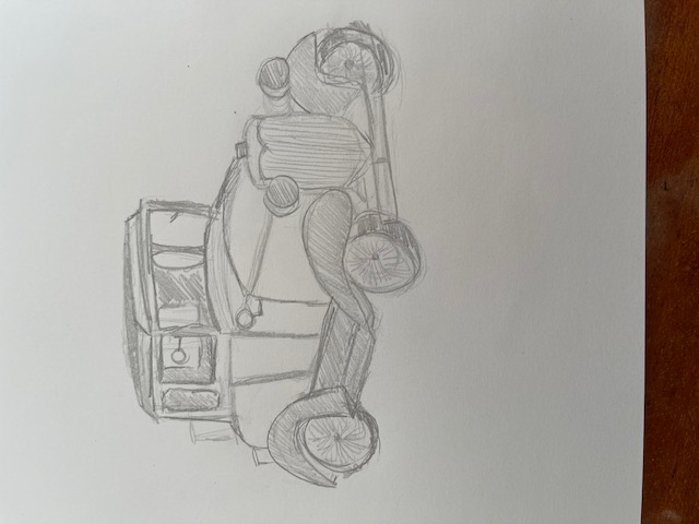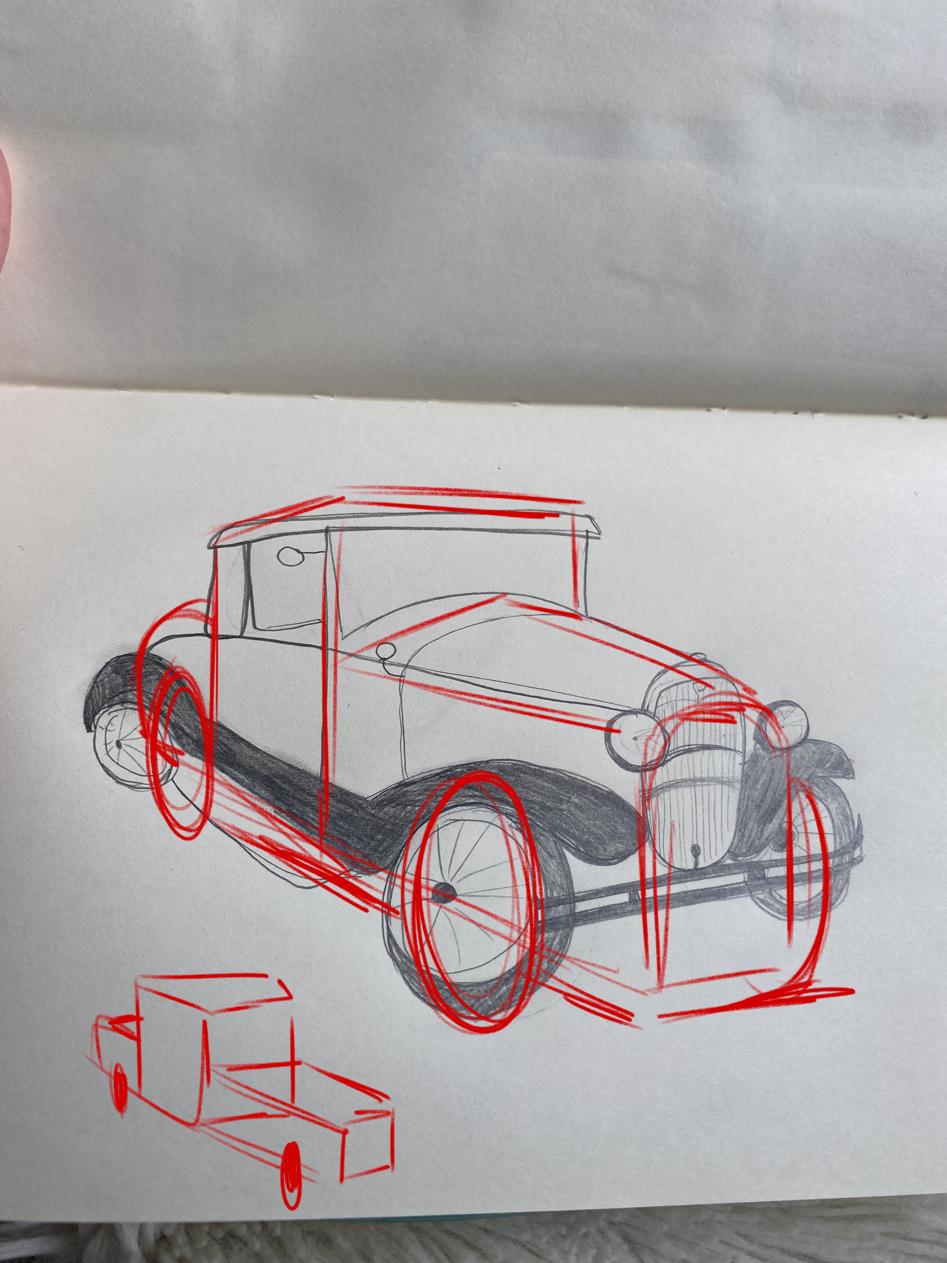 Pas mal, la voiture peut donner quelque difficulté quand on commence... Essaie de bien décomposer le sujet en forme simples (cubes, rectangles, etc). Sinon, pour ces exercices, essaie de varier au plus les angles de vues (de face, de profil, de dos, etc), le but est de visualiser ton sujet sous différents angles. :)