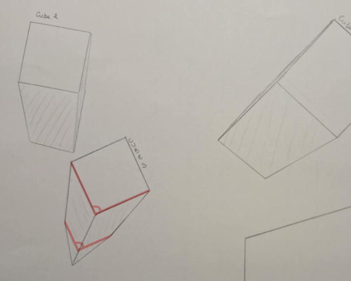 Muy feliz con este ejercicio porque realmente siento que finalmente entendí lo que me estaba bloqueando en las perspectivas. Los puntos de fuga hicieron que el dibujo fuera mucho más “coherente”. Sin embargo, todavía tengo una pregunta. Tomemos el ejemplo del ejercicio 1, cubo 3: Cuando tracé todas mis líneas hacia el PF, me aseguré de mantener las proporciones y por lo tanto mantuve los mismos cm de las aristas del cubo original. Sin embargo, cuando conecté los bordes, los dos lados que apuntan hacia el PF son bastante oblicuos. ¿Es esto problemático para este tipo de perspectiva? ¿Deberíamos mantener sólo líneas // entre ellos?