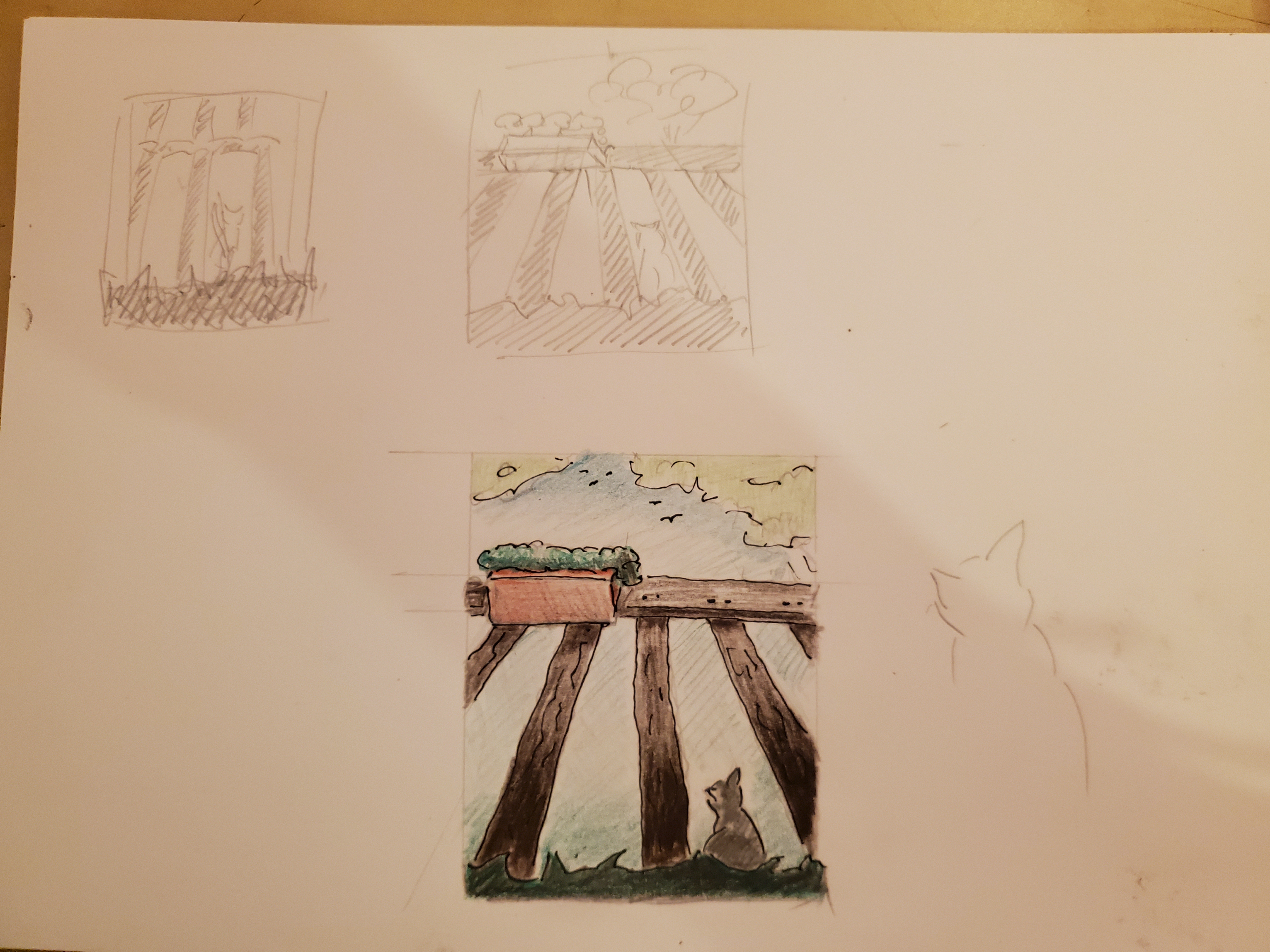Viendo tus bocetos preparatorios, veo que te tomaste el tiempo de pensar en la mejor composición para tu pieza final, lo cual es una excelente herramienta. ¡Bien hecho!