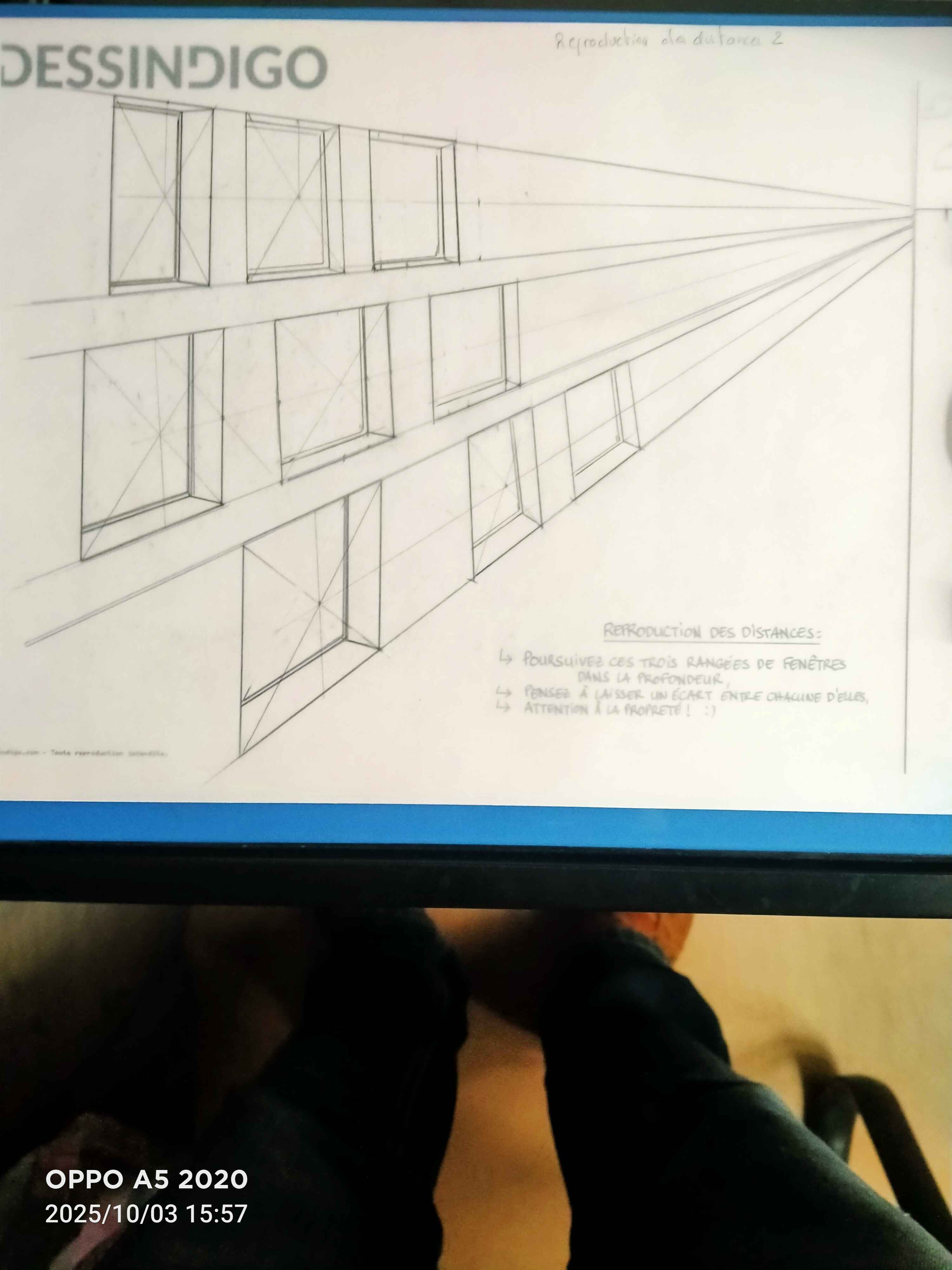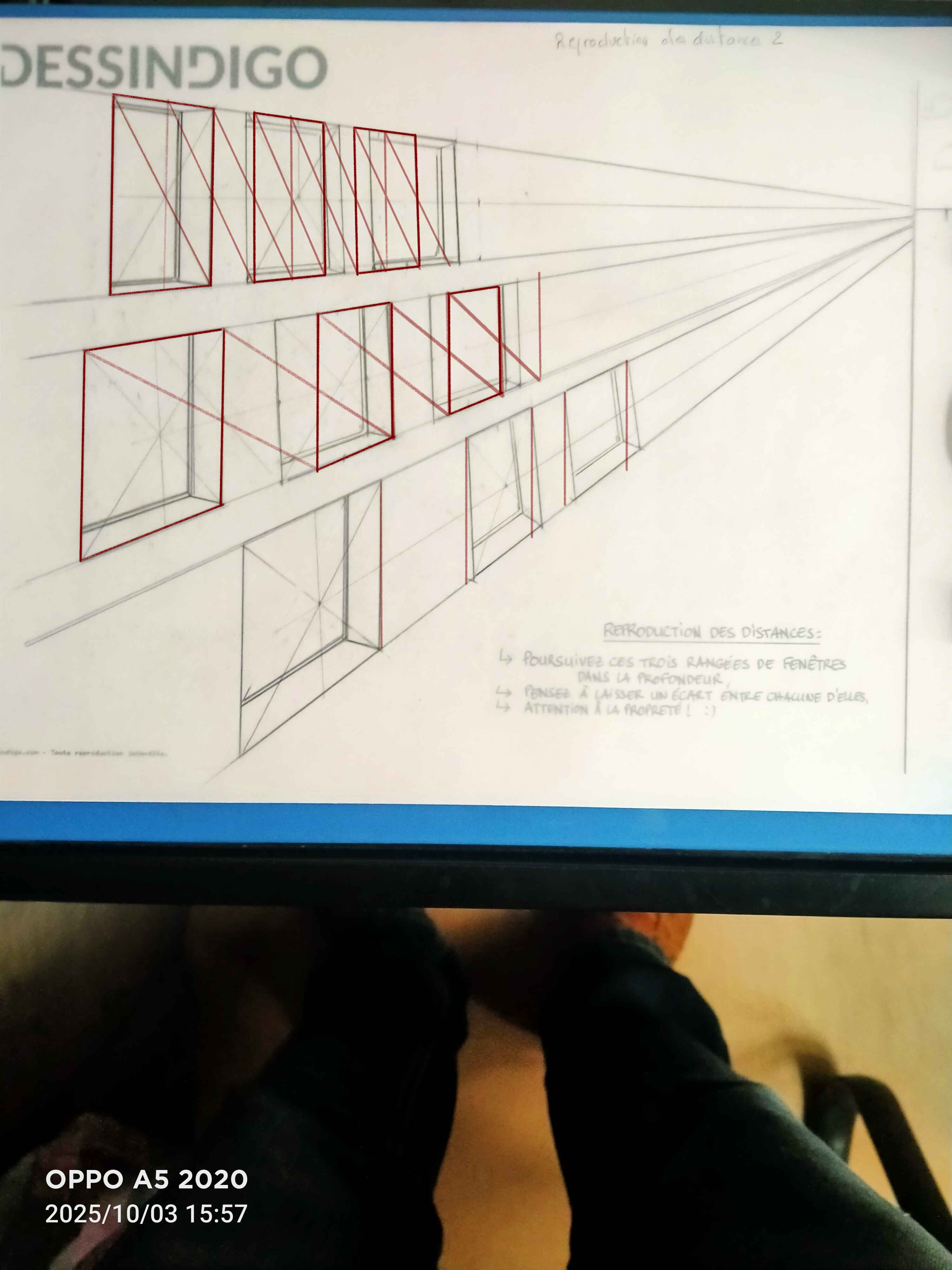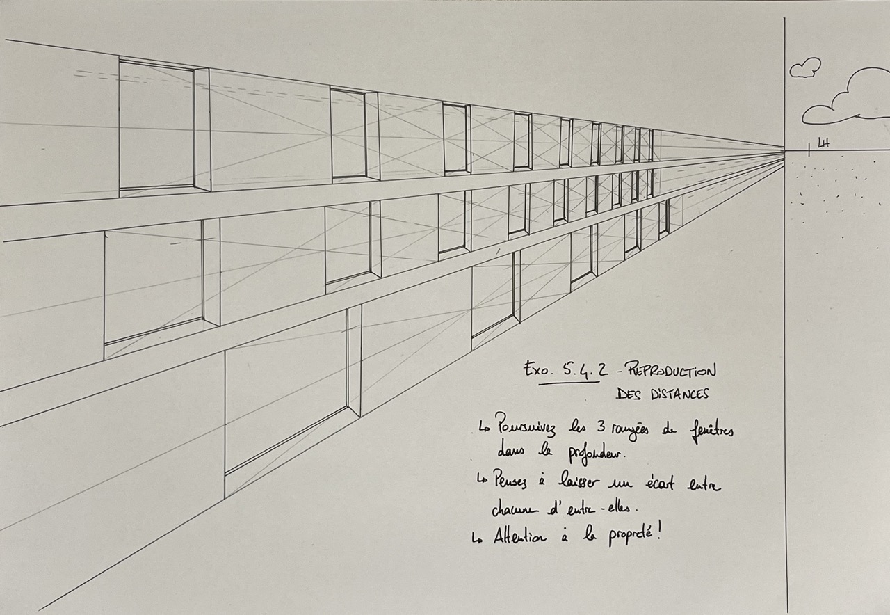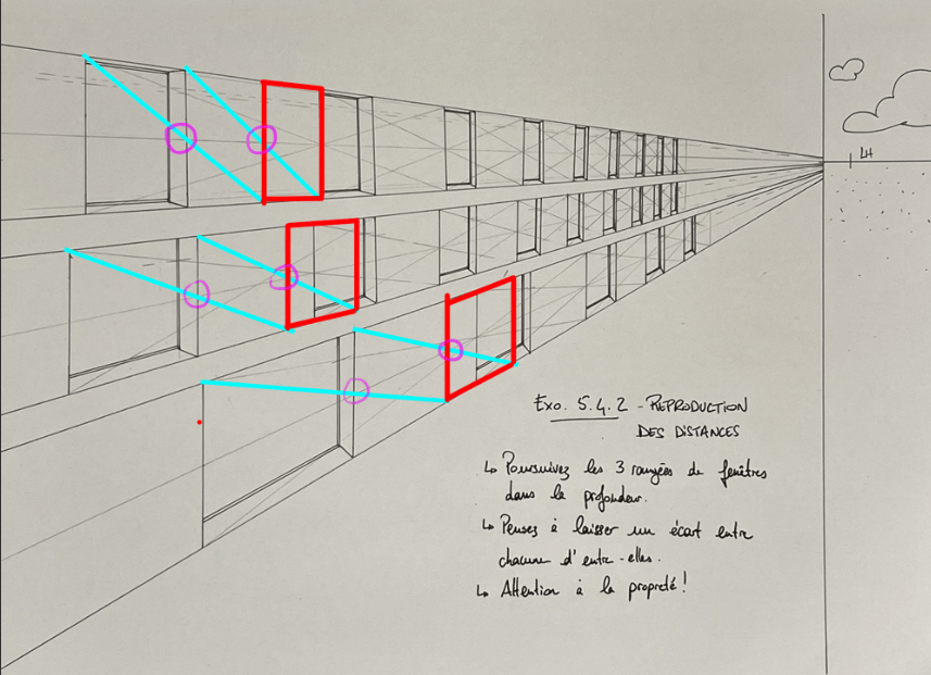 Bonsoir HYPOCAMPE, effectivement il y a un souci sur la reproduction des distances. Essaie de ne pas t'occuper des détails de la fenêtre dans un premier temps, et reproduis juste la distance d'une fenêtre entre chaque fenêtre (ça te simplifiera la tâche). Tu places la ligne de fuite centrale en tirant les diagonales de la première fenêtre, et ensuite tu tires une ligne qui part qui côté haut/gauche qui passe par l'intersection entre la parallèle opposée et la ligne centrale. Tu en tires un verticale et tu reproduis ça autant de fois que nécessaire. Une fois que tu auras tes espacements de placées tu pourras dessiner tes fenêtres! ;)