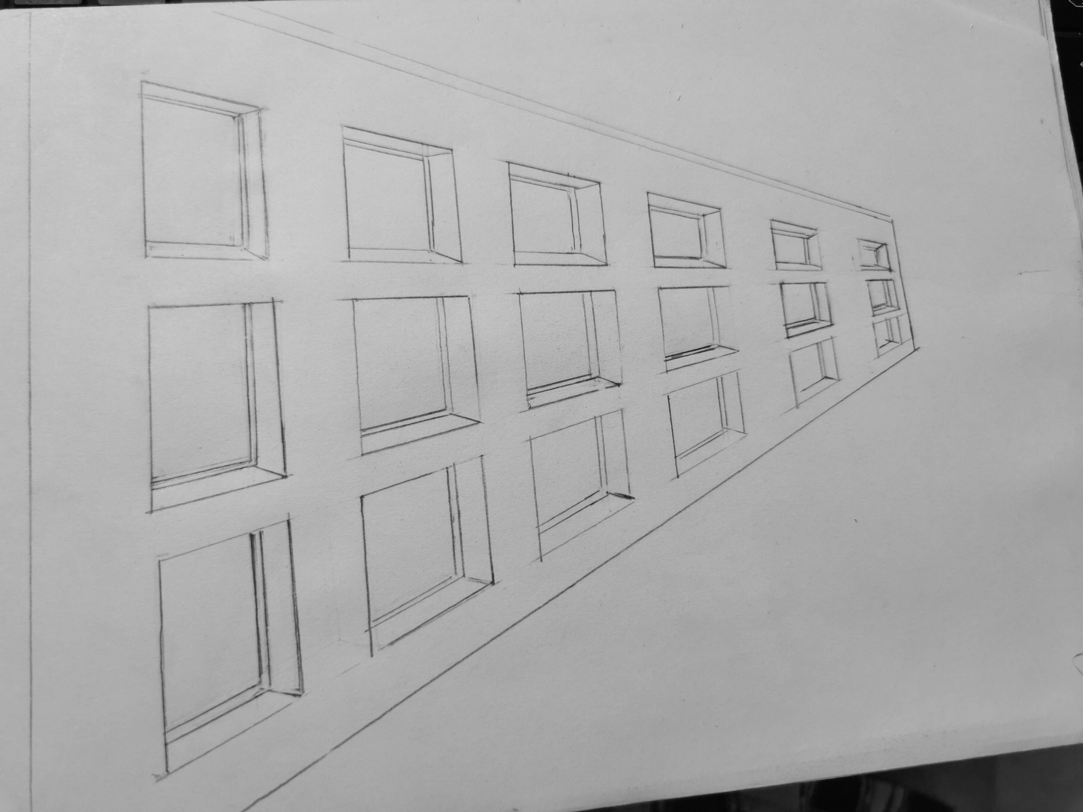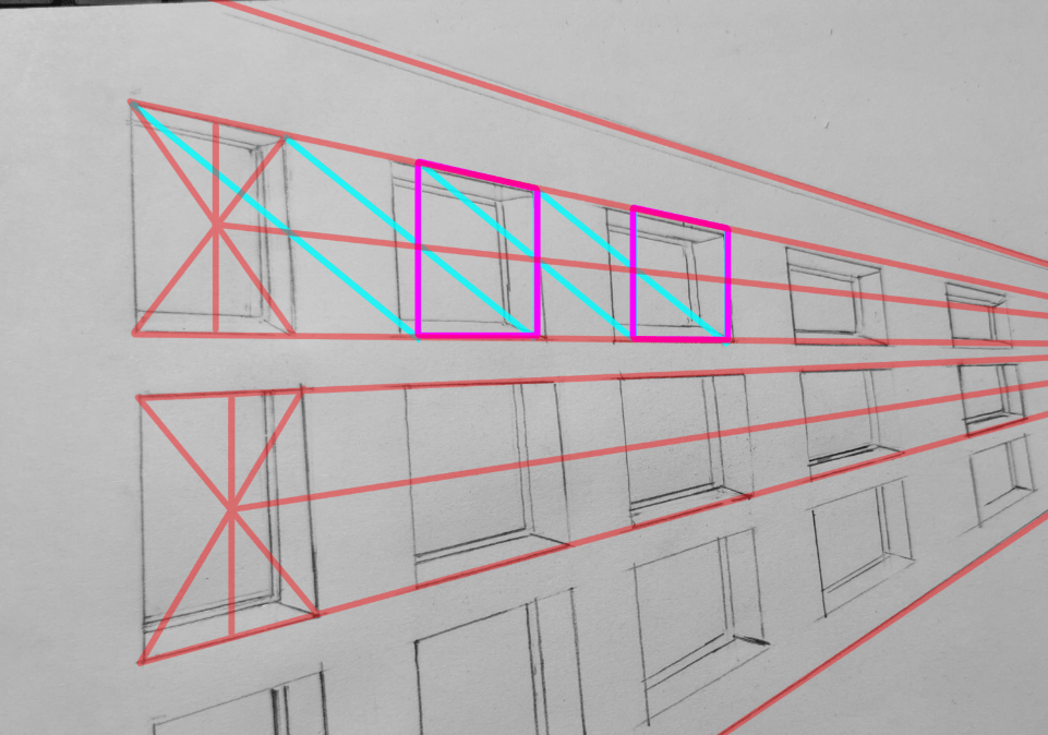 Buenas noches hipocampe, de hecho, existe una preocupación por la reproducción de distancias. Trate de no cuidar los detalles de la ventana al principio y simplemente reproducir la distancia desde una ventana entre cada ventana (simplificará su tarea). Coloque la línea de fuga central tirando de las diagonales desde la primera ventana, y luego dispara una línea que deja en la parte superior/izquierda que pasa a través de la intersección entre el paralelo opuesto y la línea central. Disparas una vertical y la reproduces tantas veces como sea necesario. ¡Una vez que tenga sus ubicaciones de colocación, puede dibujar sus ventanas! ;)