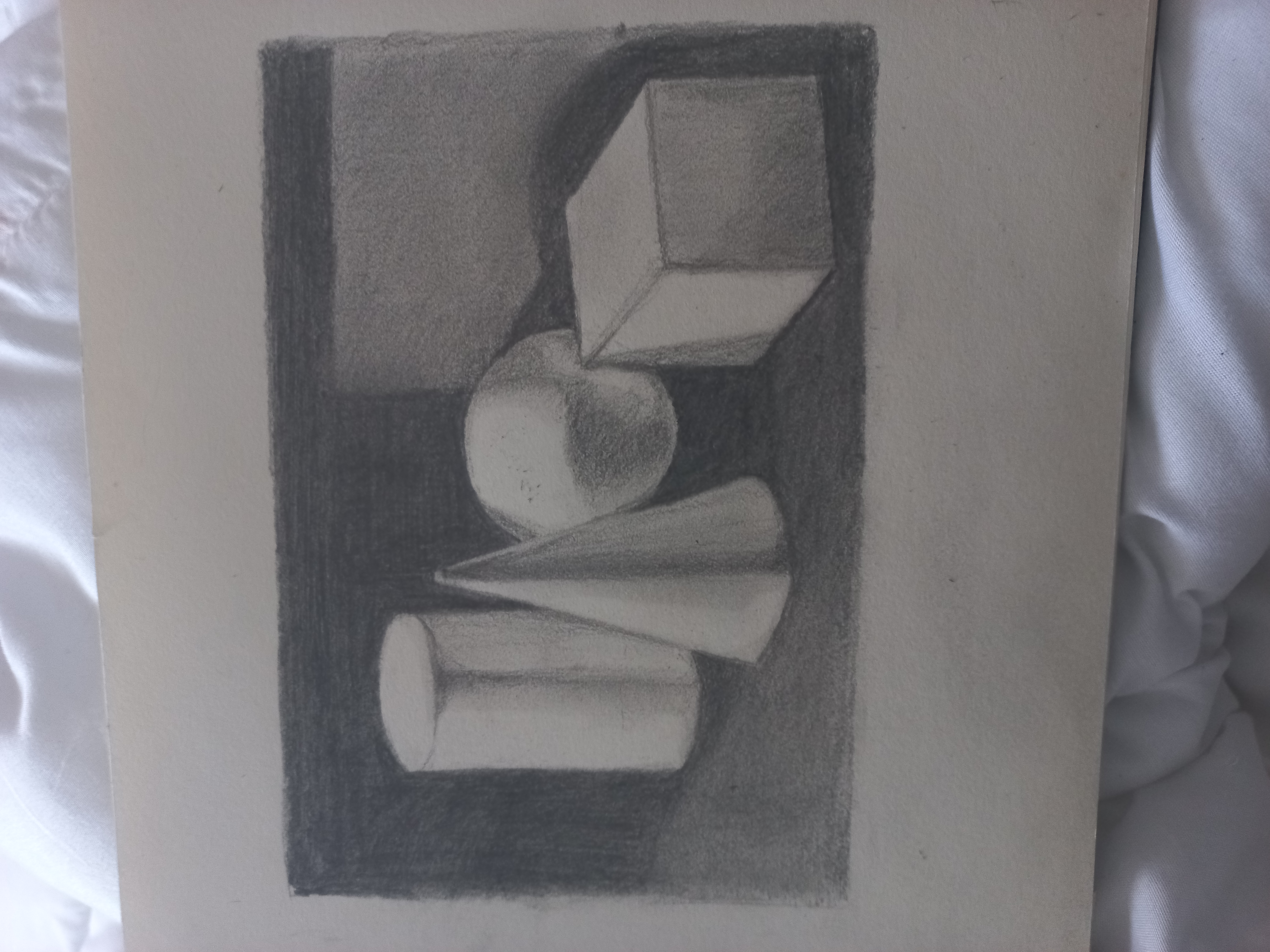 En términos de ejercicio, es bastante bueno :) tu dibujo es sólido y la lectura de los volúmenes funciona muy bien. Los valores están bien fijados y entendemos claramente la luz, especialmente en el cono y el cilindro. No dudes en trabajar las transiciones más suavemente para acentuar la fluidez de las sombras y proporcionar una representación aún más realista :) Para ir más allá, podrías acentuar ligeramente la diferencia entre las caras claras y las caras semisombreadas, particularmente en el cubo, para reforzar la jerarquía de tonos. Las sombras proyectadas también se beneficiarían de ser más nítidas cerca de los objetos y un poco más suaves a medida que se alejan, lo que daría aún más realismo al conjunto. Es un muy buen trabajo, sigue así 👍