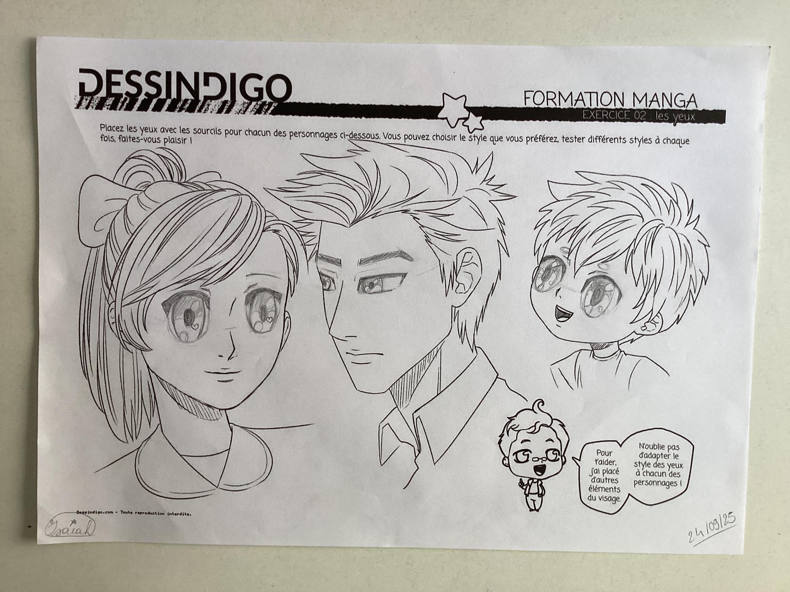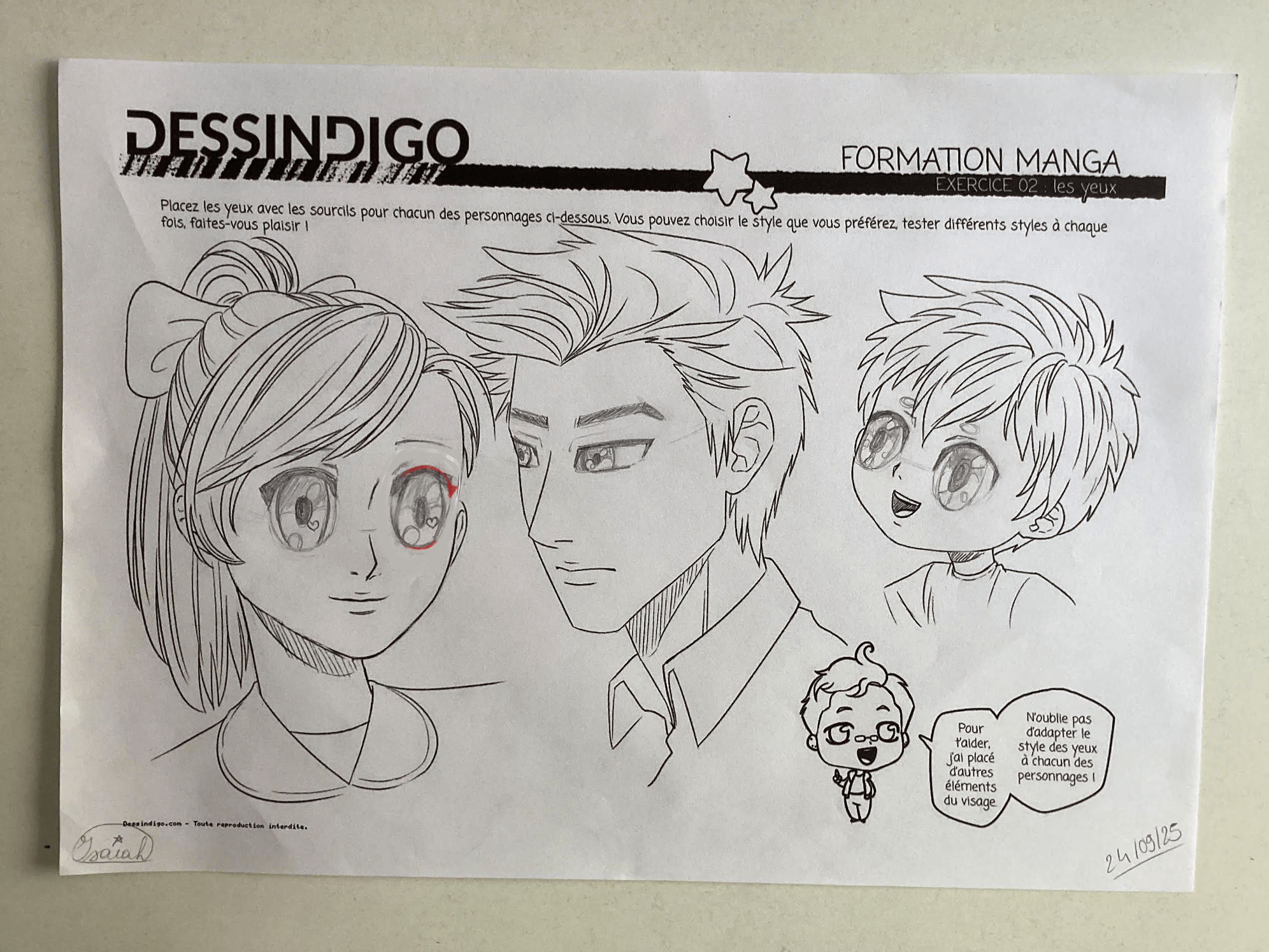Cet exercice est vraiment réussit également :) il y a juste un petit détail sur au niveau de l'oeil droit du personnage féminin, j'aurais fait la pointe légèrement plus tombante pour que les yeux aient l'air plus alignés, et l'oeil légerement plus bas également :) Mais mis à part c'est vraiment nickel, bravo 👍