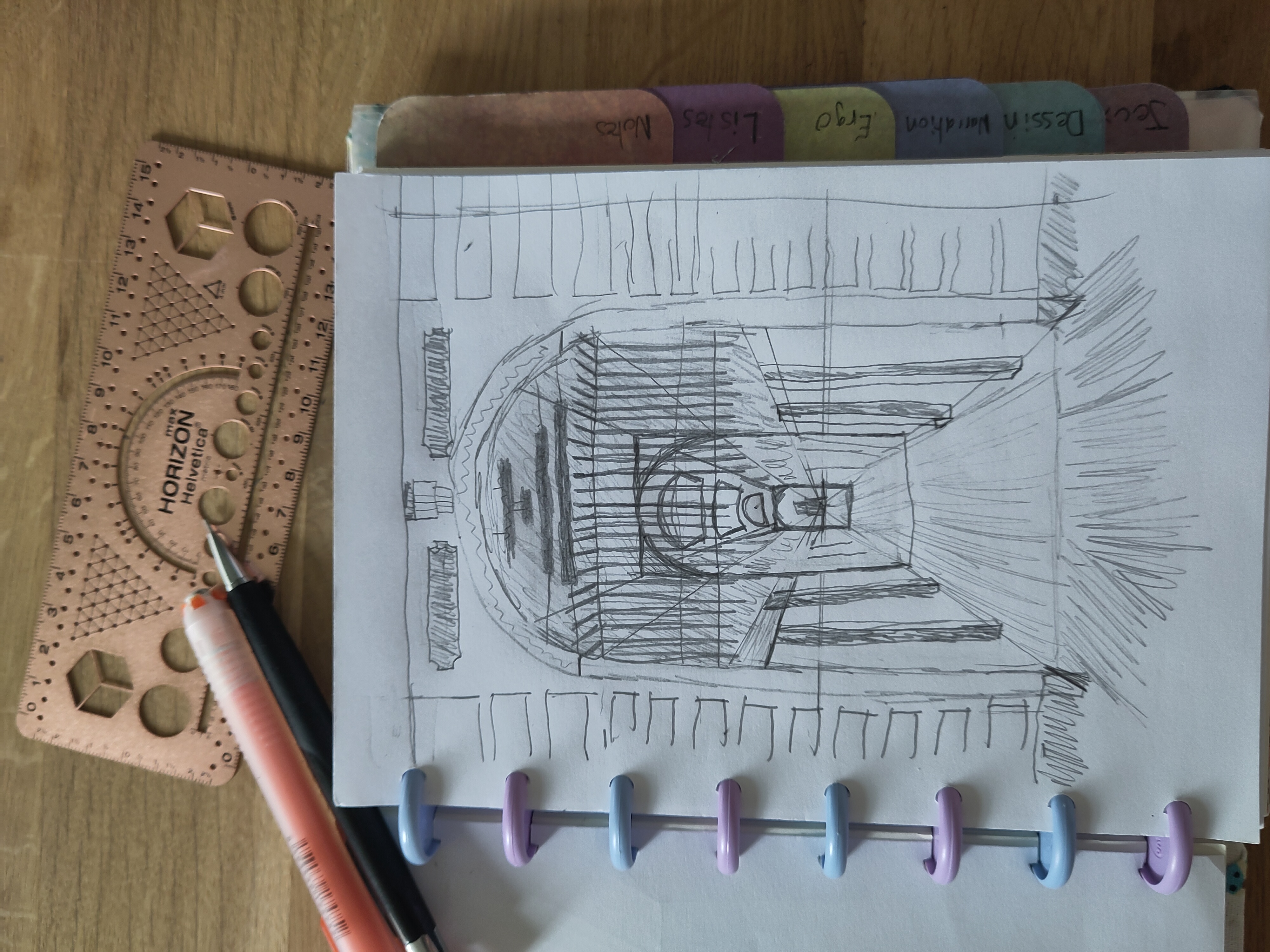 voilà j'ai réalisé ma première esquisse, c'était pas simple. Mais il faut se lancer. En regardant la correction, je m'aperçois que j'ai fait une erreur, je ne suis pas en vue de plongée, du coup la perspective n'est pas tout à fait juste. Je réessaierai de le refaire.