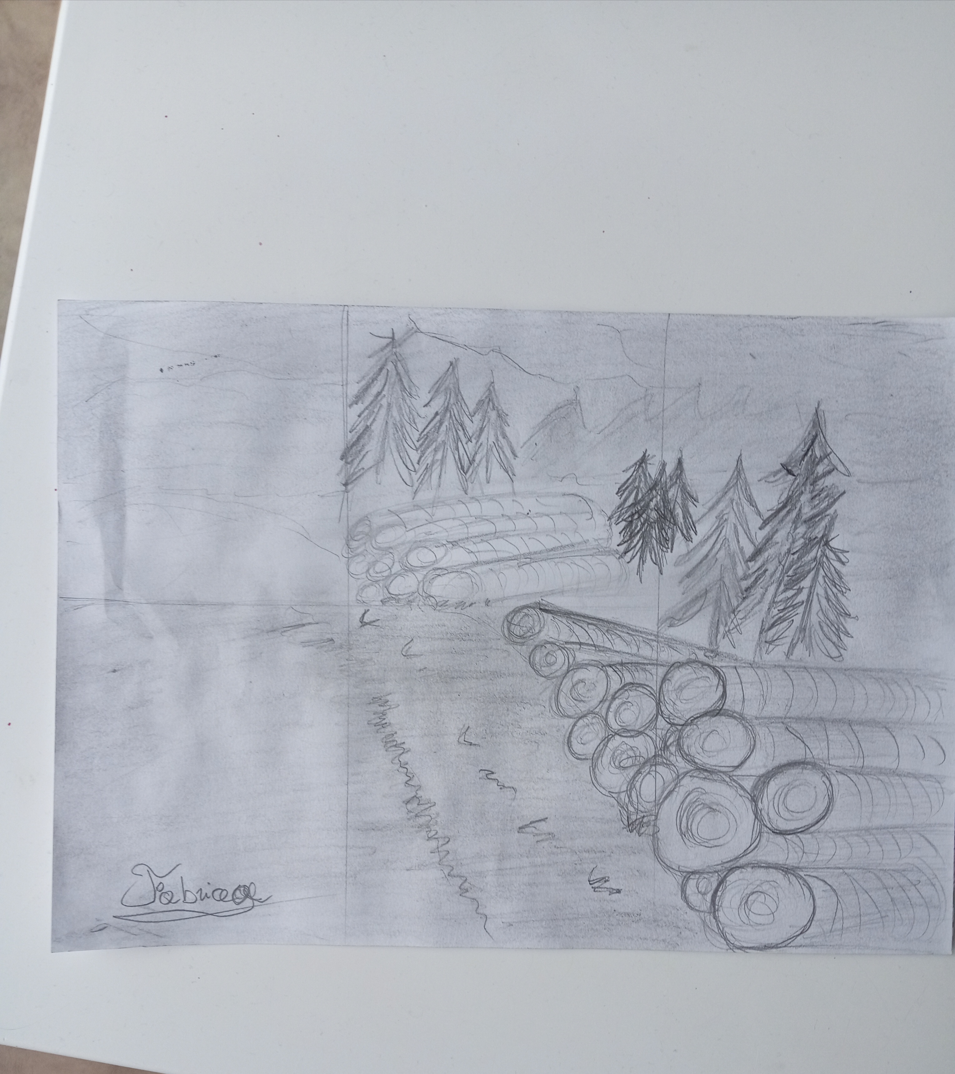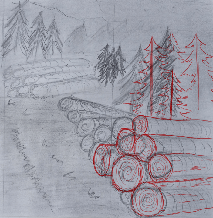 Je partage avec toi quelques suggestions : observe comment les troncs s'entremêlent pour s'empiler. C'est ainsi que l'on obtient une sensation de gravité car, sinon, les troncs sembleront léviter. Prends le temps de faire des traits plus minutieux ; cela fera toute la différence dans ton dessin.