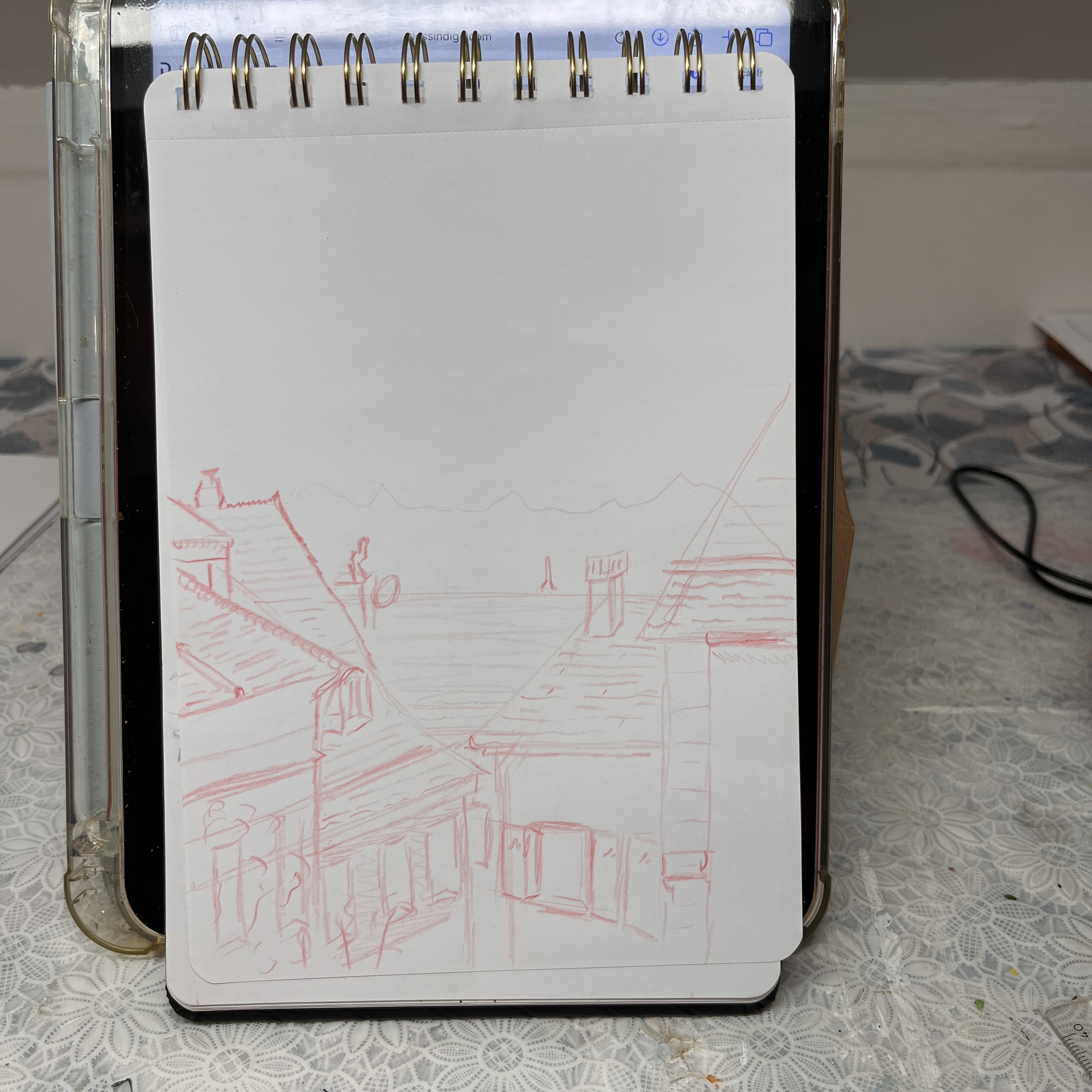 Ton esquisse est vraiment trè réussite ! La perspective est nickel et les matières sont bien retranscrites, un petit détail pour la rendre parfaite, tu aurais pu éclaircir très légèrement le toit de la dernière maison dans le fond afin qu'elle est une valeur très légèrement plus claire que le toit juste à côté et qu'elle se detache un peu plus. En tout cas c'est très propre, bien joué 👍