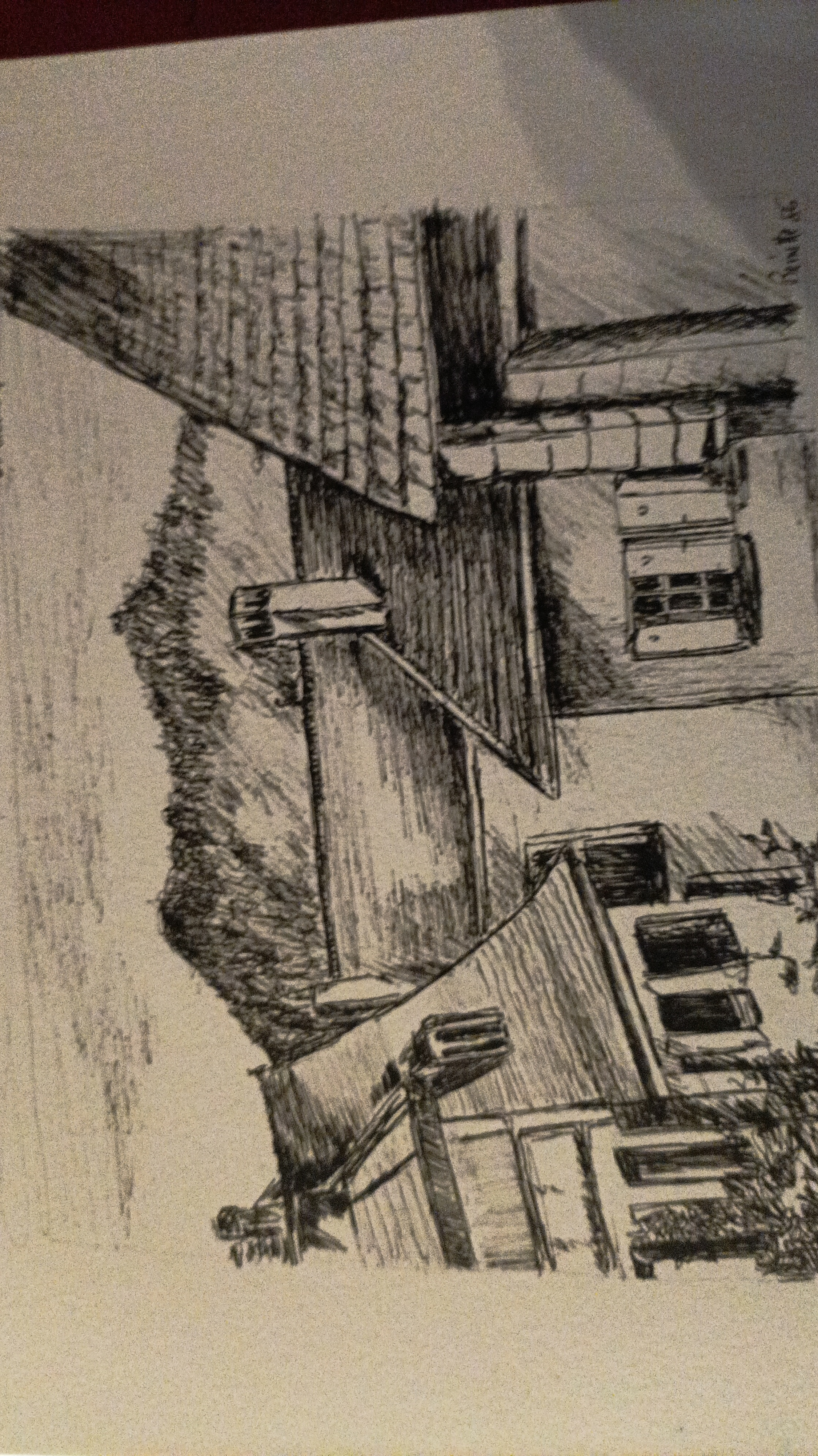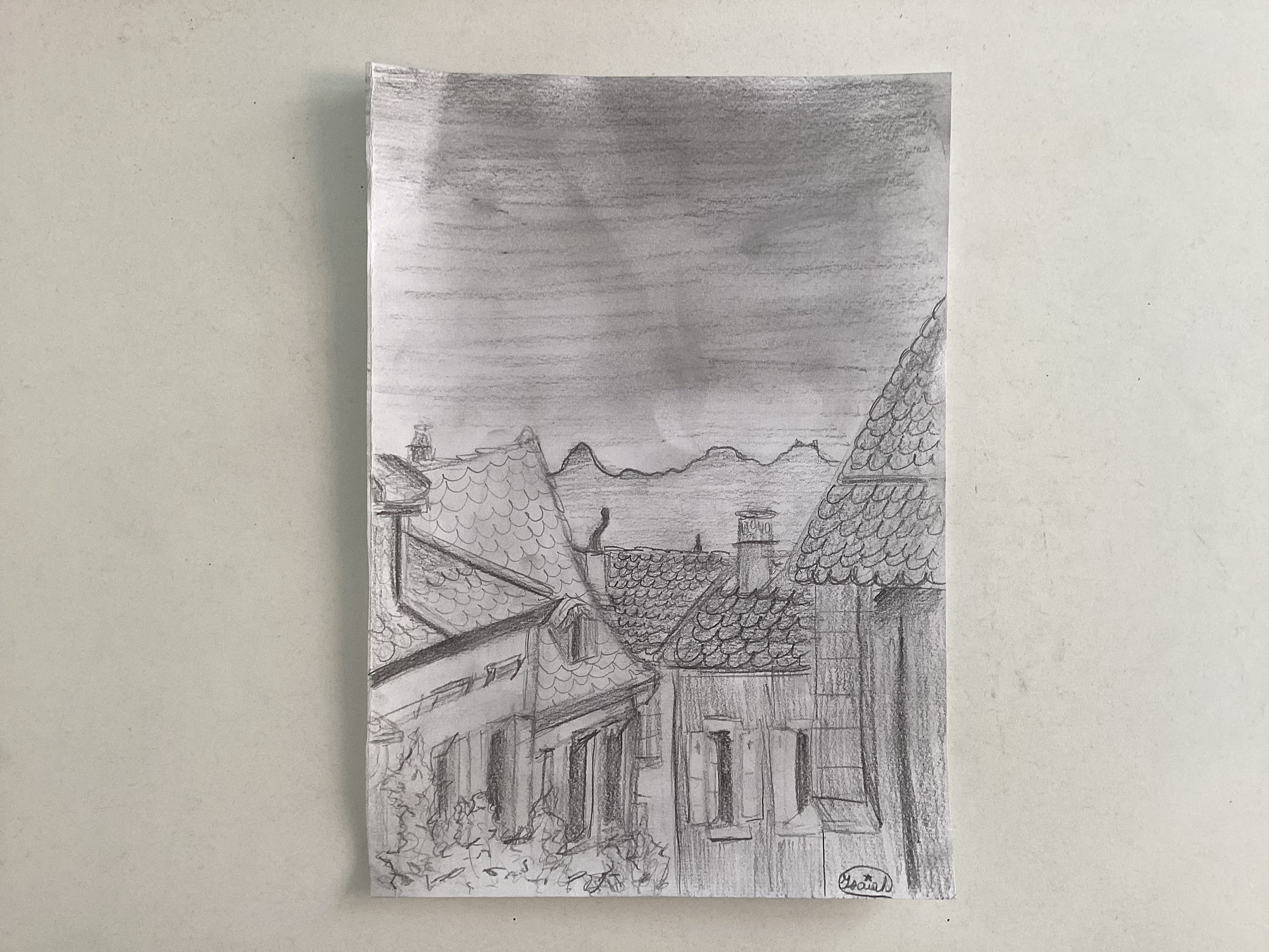 J'aime beaucoup ton esquisse, les toits ont un charme particulier. Je te recommande d'ombrer avec patience, en réalisant des couches très légères et étendues avec le crayon avant d'estomper ; cela te permettra d'éviter les espaces blancs.