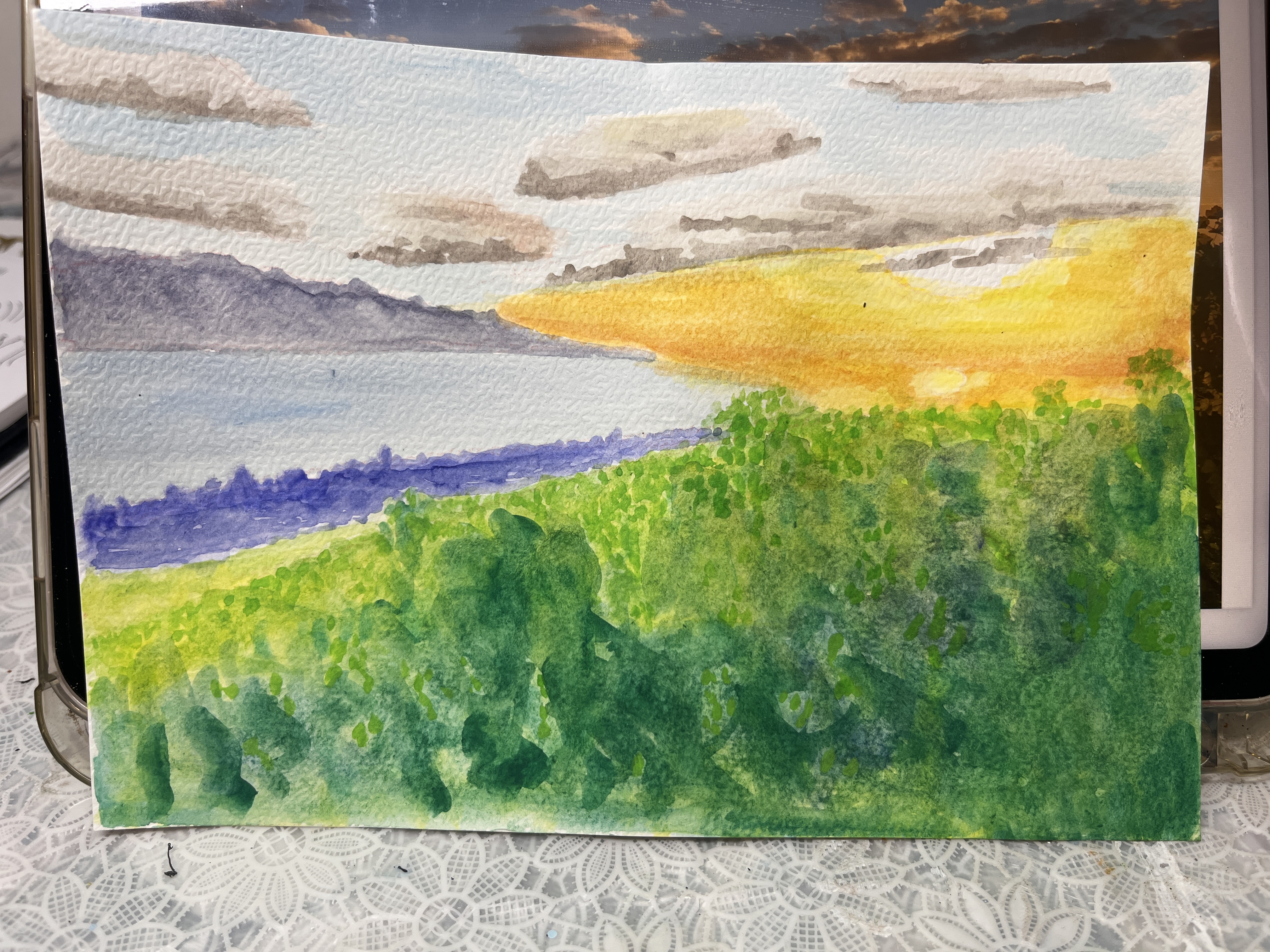 Hola, aquí está mi primera acuarela. ¡No es fácil! Especialmente el cielo