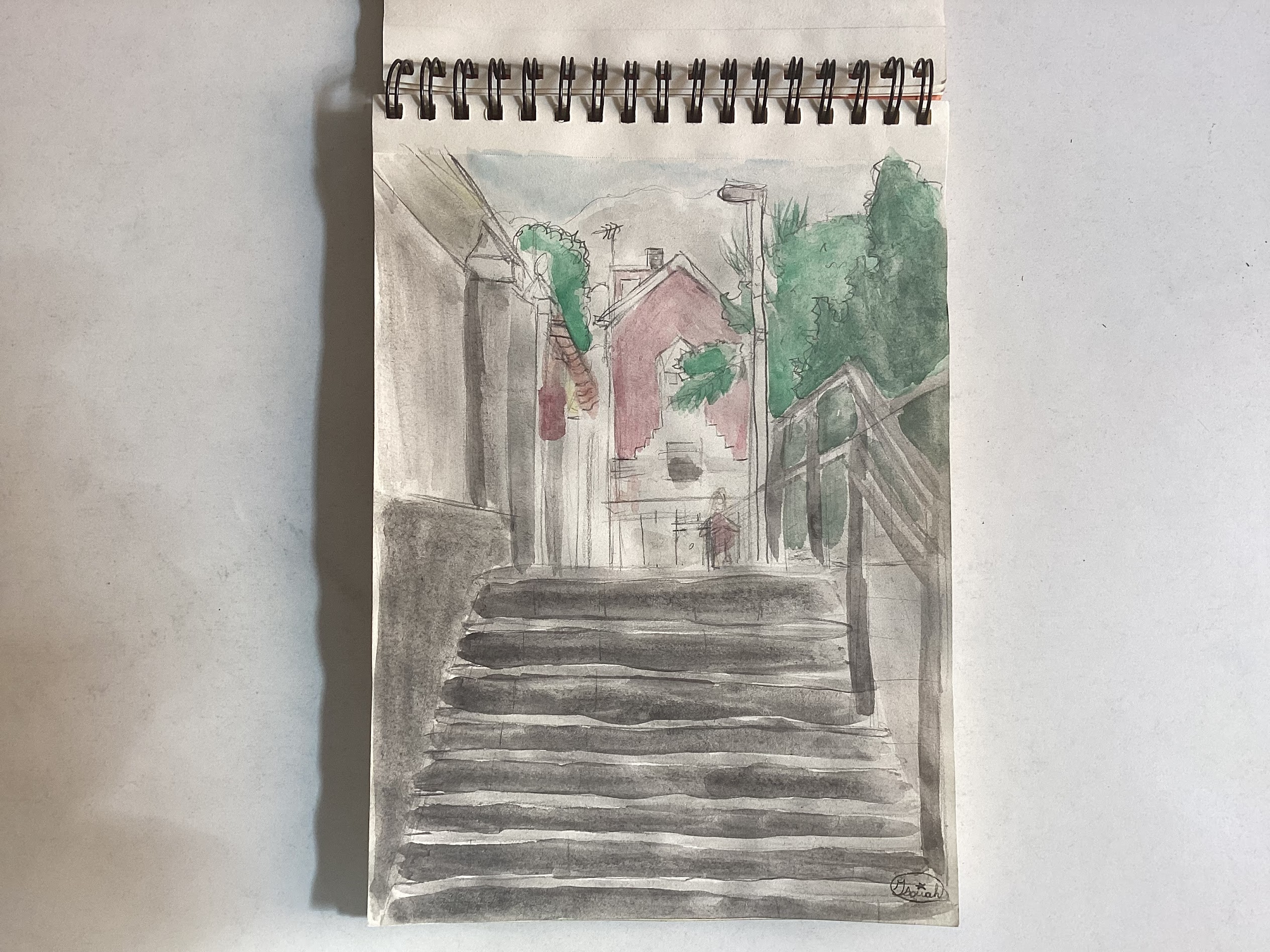 ¡Tu boceto tiene mucho éxito! La perspectiva es correcta, las líneas son ligeras y la composición agradable. Aunque noto que el color aplicado queda un poco apagado, te recomiendo que limpies bien tu brocha al cambiar de un color a otro; esto ayudará a mantener la vitalidad de los colores. Por otro lado, si esa es la atmósfera que querías lograr, entonces está muy bien hecho.