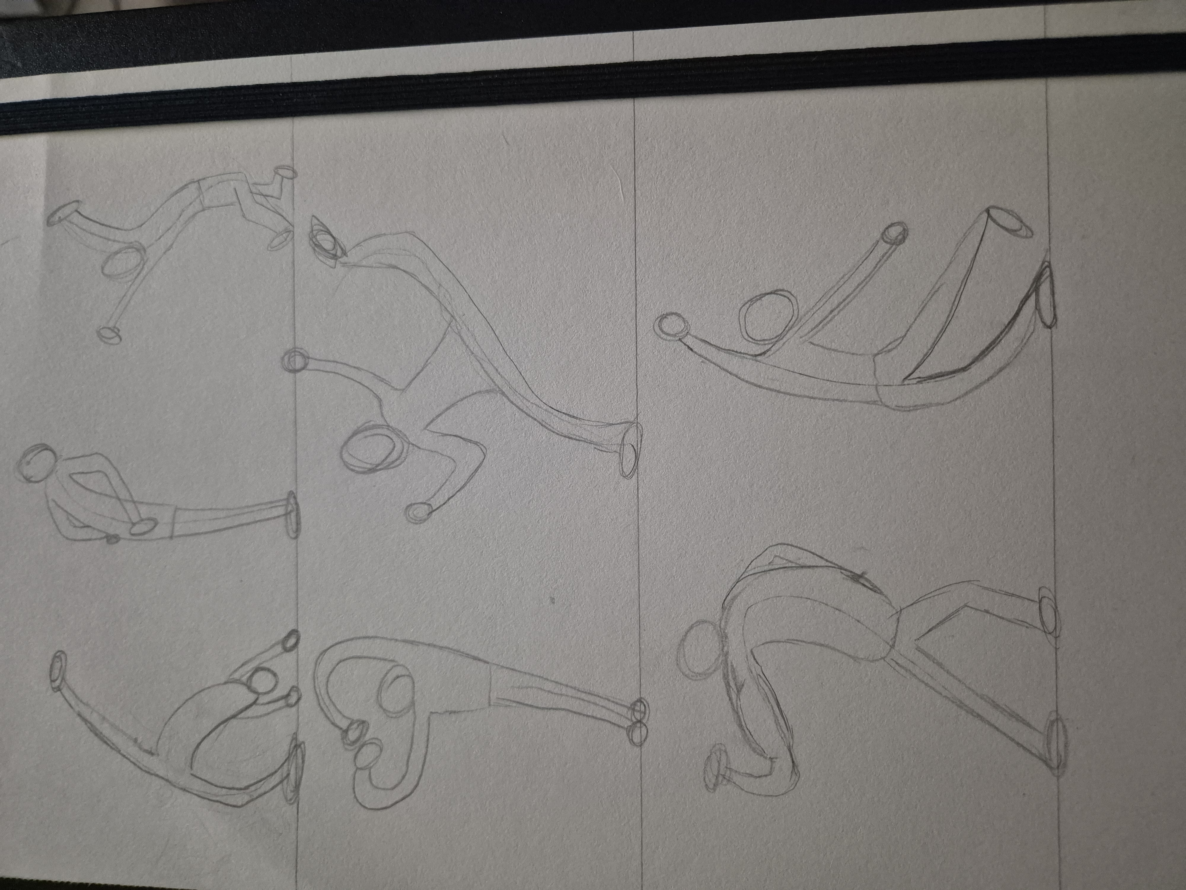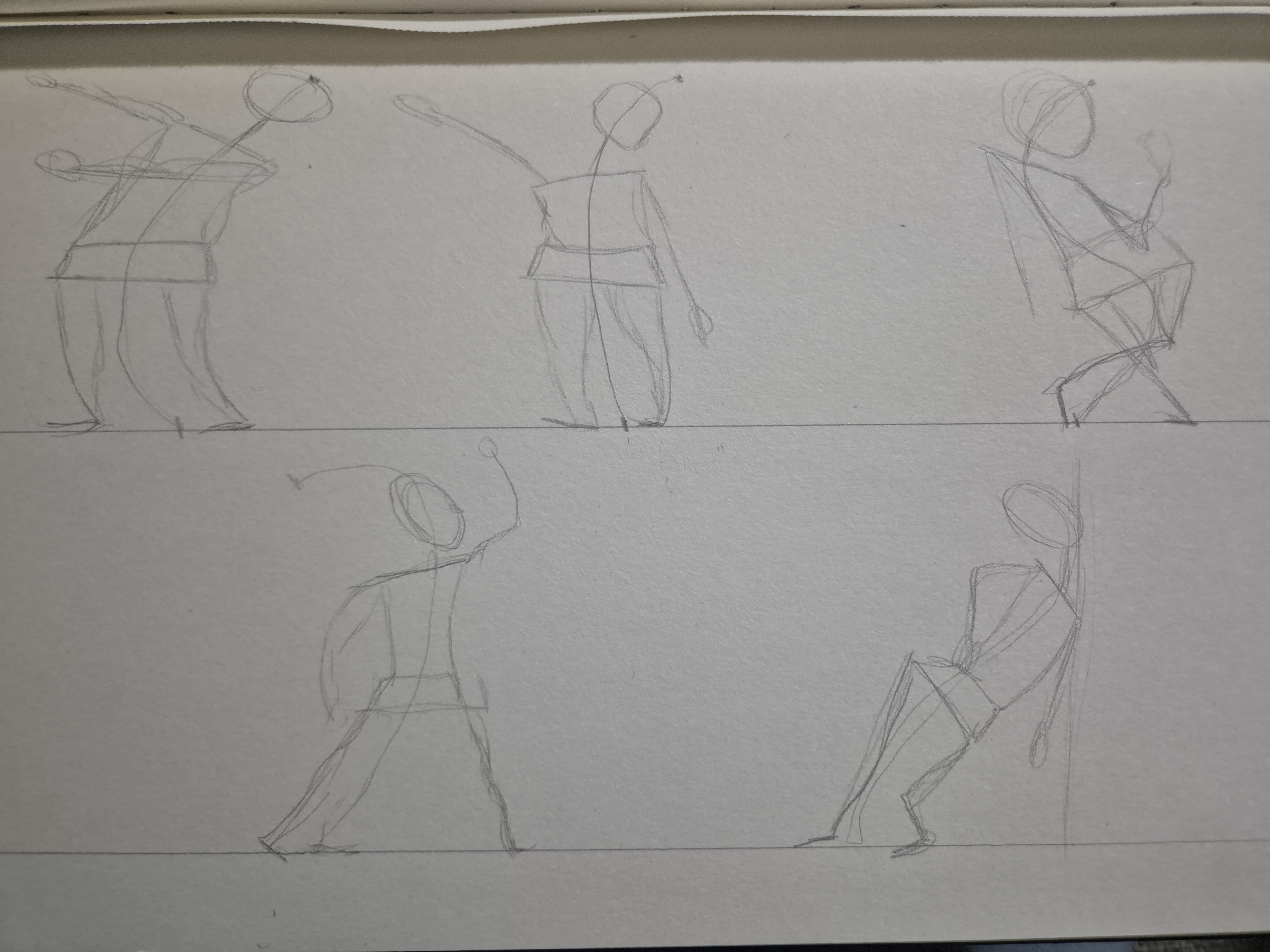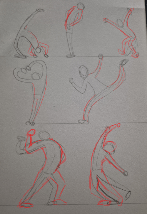 Tu as fait une bonne approche ! Cependant, essaie de faire en sorte que les corps suivent beaucoup plus la ligne d'action, en laissant de côté la rigidité. Pense aux dessins animés, quand les personnages semblent ne pas avoir d'os.