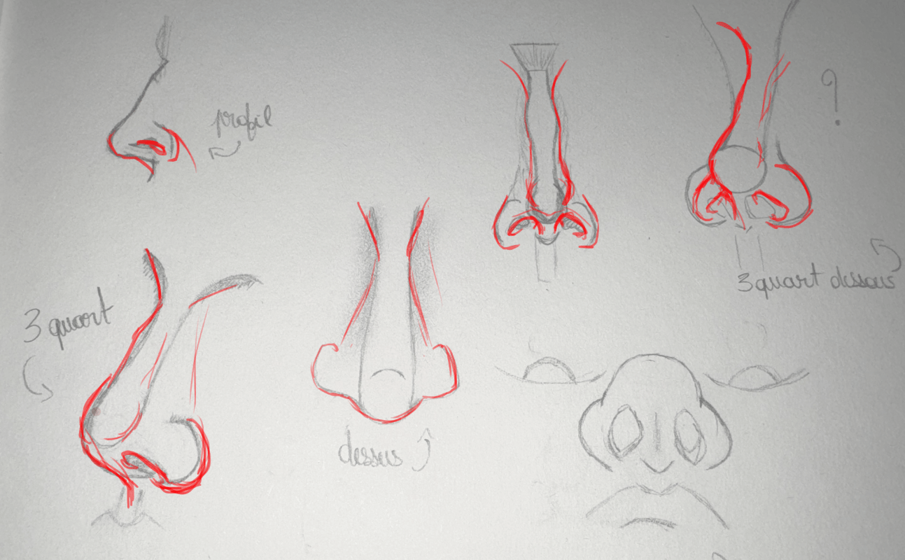 En effet, tu as réalisé plusieurs tentatives réussies, avec la structure correcte d'un nez. Je te partage quelques précisions sur sa forme. Fais attention à l'horizontalité des narines et à l'alignement du septum (ou de la cloison nasale) avec les pupilles des yeux.
